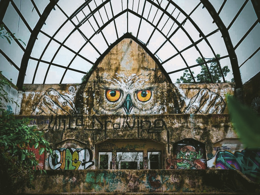 ??从入口大门的石柱开始,每走几步就能看到各种各样的涂鸦。地板上游弋的金鱼,林间墙壁上真实的霸王龙头骨,仅剩龙骨的大厅二楼墙壁上巨大的猫头鹰的双眼,影壁上绽放的莲花,石廊下的巨大蝴蝶,各种花园里残缺的,倒落在地上的雕塑以及阳光透过浓密的树荫投下的斑驳阴影,整个氛围让人既害怕又忍不住继续探索下去。