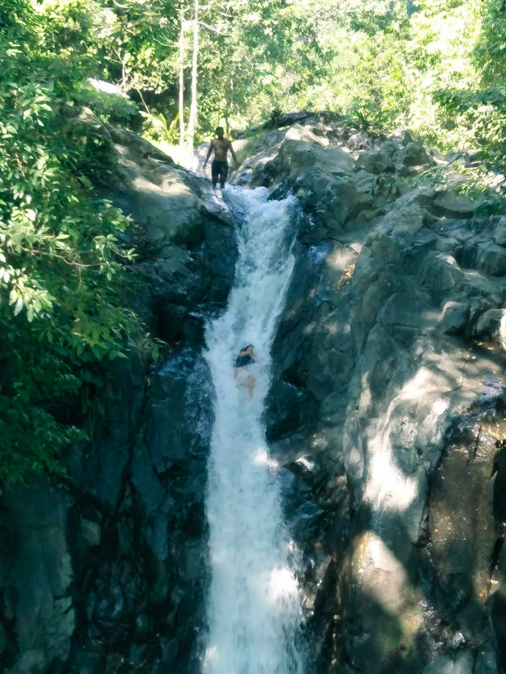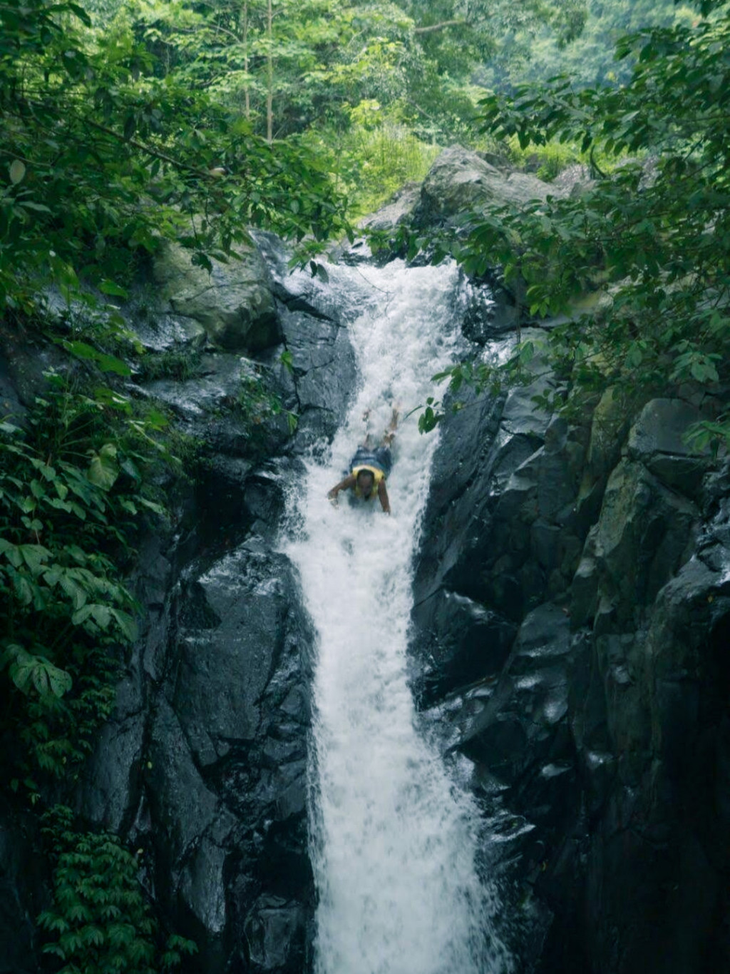 👉从入口处进入,需要穿过一小段乡间小路和稻田,穿过爬满藤蔓的墙壁拾阶而下,最先进入眼帘的是一汪小小的深潭。这里是瀑布探险的第一站——5米高的跳水台。穿好救生衣从这里跃下,游到对面沿石阶到瀑布顶,向导会教你摆好合适的姿势,从瀑布上顺流而下冲入潭中!只要你的体力足够好,这里是不限次数的。