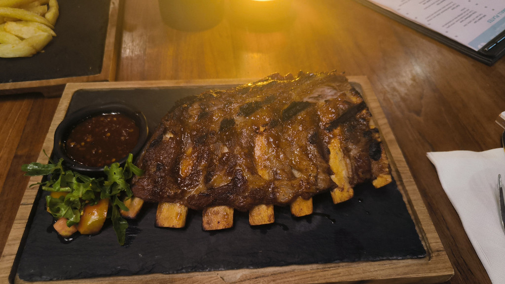 终于到了晚上happy的时间,有了昨天的教训和同胞的交流,今天的晚餐果断选择了西餐,不得不说无比正确,这里推荐一家猪排店 Ginta Grill and Inn,看到下面的图片了嘛,一整块猪排不到90块,鸡尾酒还买一送一,味道和性价比都很高,值得一试。
