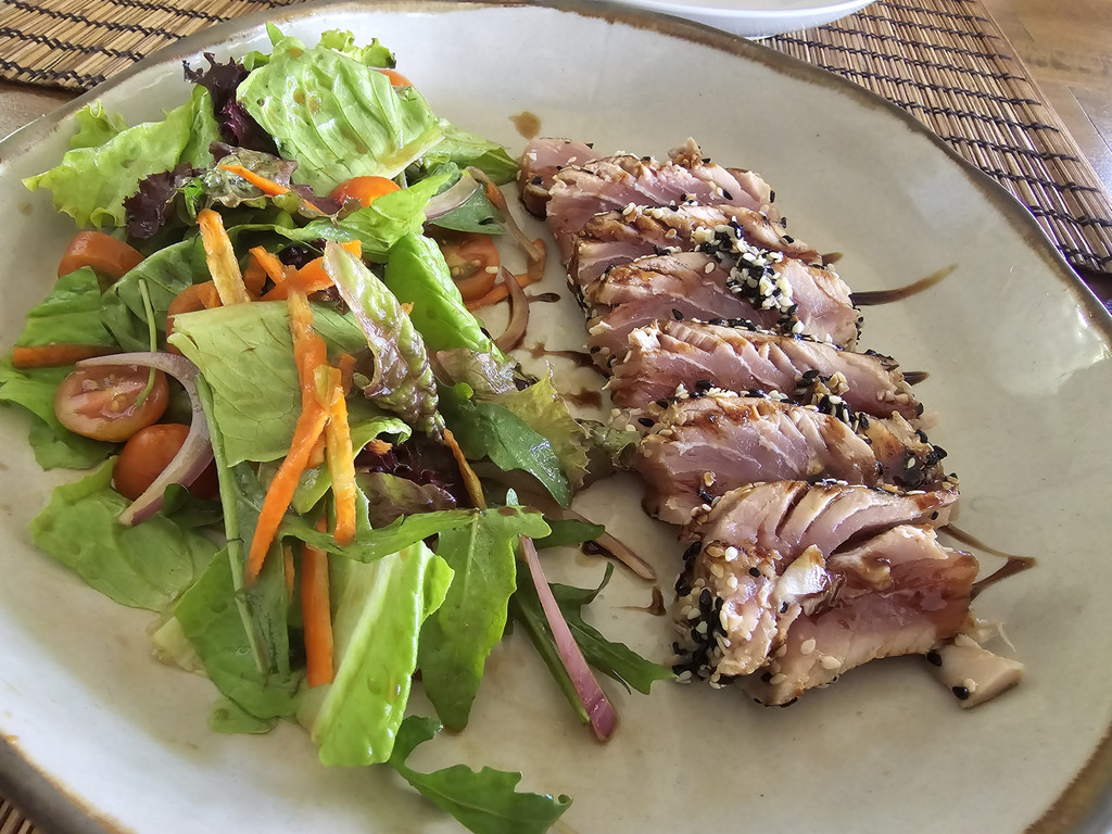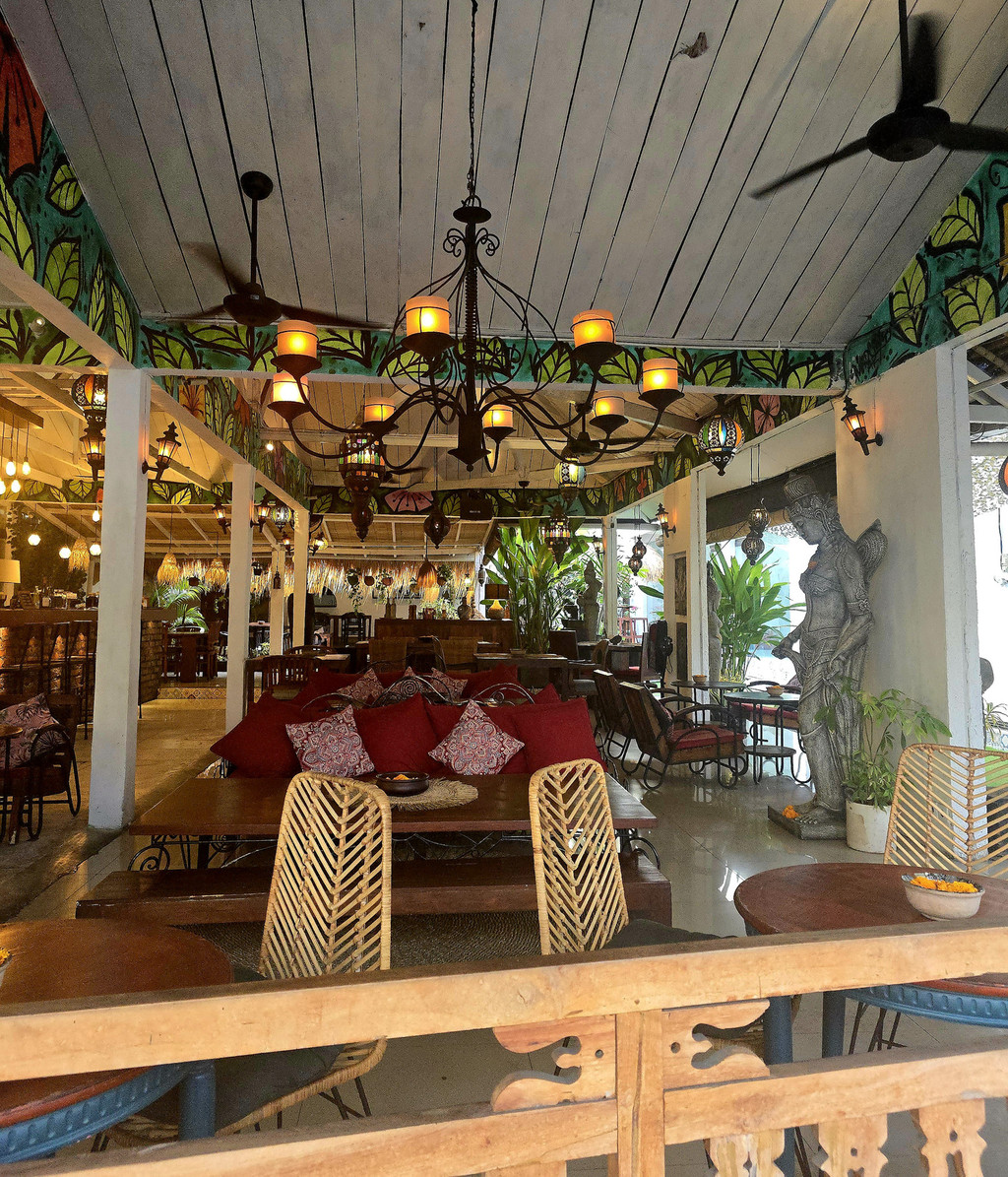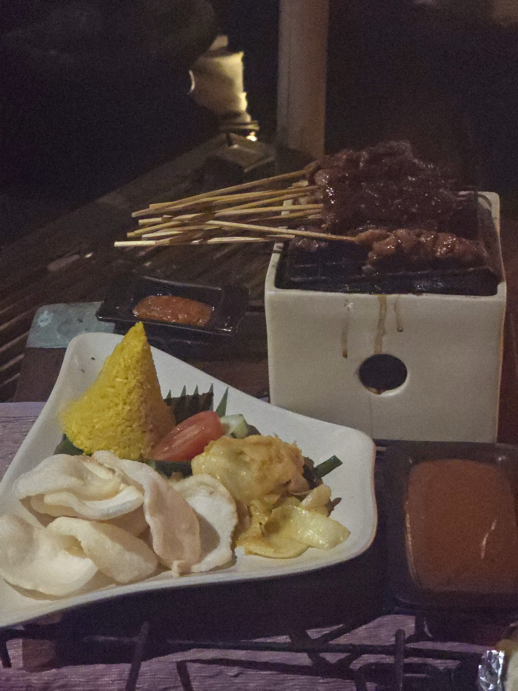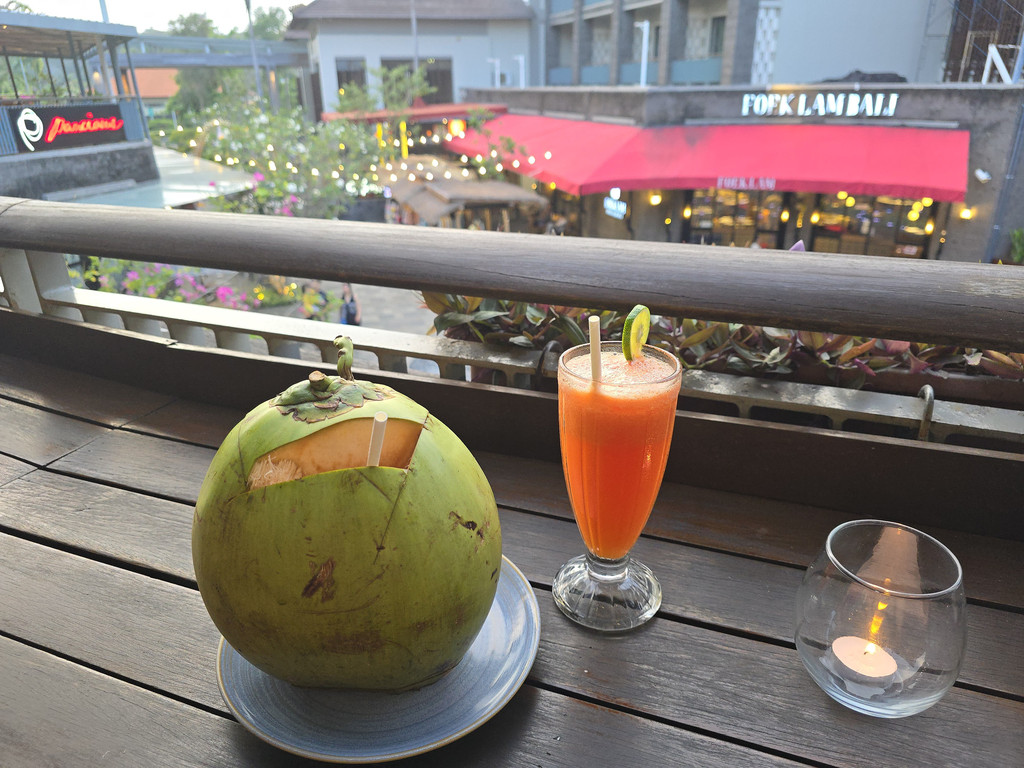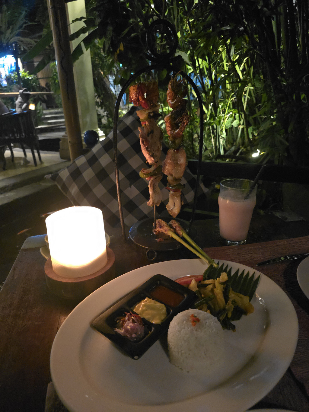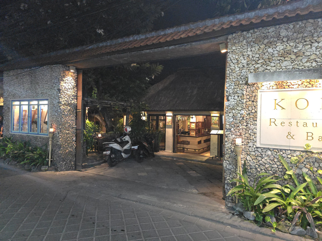 离开沙滩,我们前往接近库塔市区中心主路Jl Raya Legian的Kori Restaurant & Bar Kuta, 这是一家我们随心选择的餐厅,主要是被巴厘岛特色建筑的门面吸引了,进去之后还有小桥跨过水池,而水池边还有两个木亭子,每个木亭子有一个三人桌,临水而坐,我们就坐在了其中一个。可能由于环境太清幽,这里的职员行动也似乎有点迟缓。Vegetarian Spring Rolls,刚刚上桌的时候,外皮真的是酥脆香口,但是又因为内馅是蔬菜,还有比较充足的水分,真正做到外脆内软。GIANT HANGING SEAFOOD GRILL,两大串海鲜烧烤,每串都有鱿鱼,鱼块,海虾,材料新鲜,总是美味的,可惜鱼肉太熟了。HOT STONE Fresh Yellow Fin Tuna,热石上桌的时候,烟火气十足,的确是很吸引眼球的,只是有点浪费了吞拿鱼的新鲜和美味,可能是热石太烫了,导致鲜嫩的鱼肉变成几乎全熟,鱼肉都变干了。KORI CHEF SATE,很高性价比的烤肉串,整个餐有八串肉,还有配菜和黄姜饭,两种肉的酱汁和调味都不错,肉质都可以,但是鸡肉比牛肉好吃,鸡肉紧实有口感,牛肉反而不知道是因为品种还是部位的原因,吃起来太干硬,应该是因为缺少油脂,肉串上桌放在炭炉上轻烤,保持烤肉在进餐过程不会变冷变硬。Milkshake,很顺滑,感觉上是真材实料的,至少牛奶部分没有偷工减料。餐厅内部同样有一些木雕装饰,彰显巴厘岛特色,虽然是根据餐厅店面的颜值挑选的,但是整体用餐体验还是很不错的,随性而为会遇上未知的好坏,但是本来很多事情就是尽人事听天命而已。