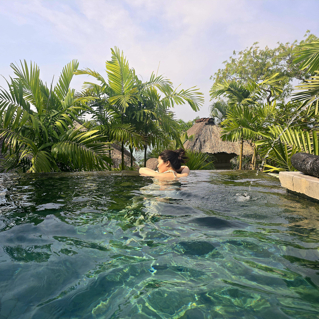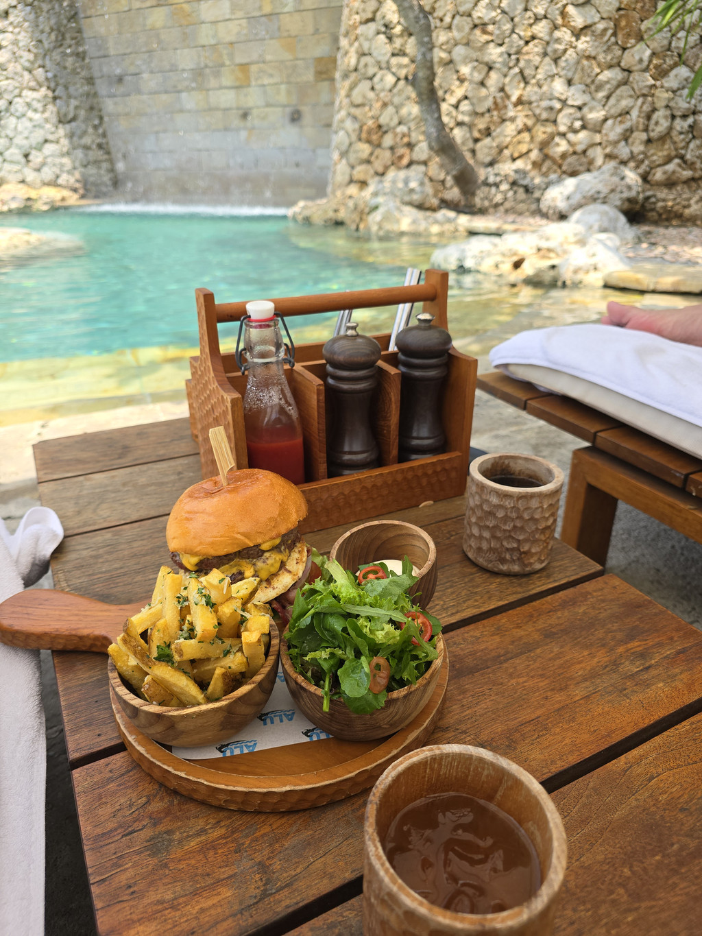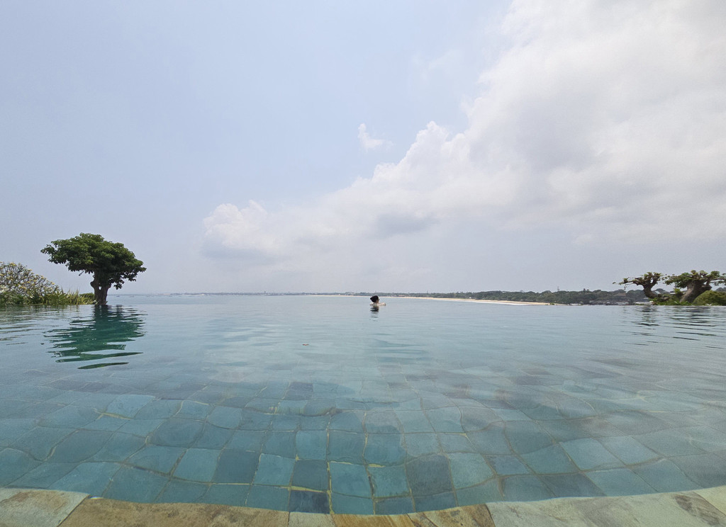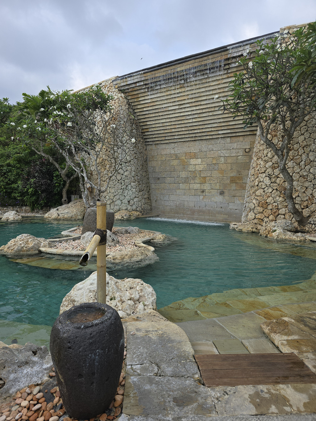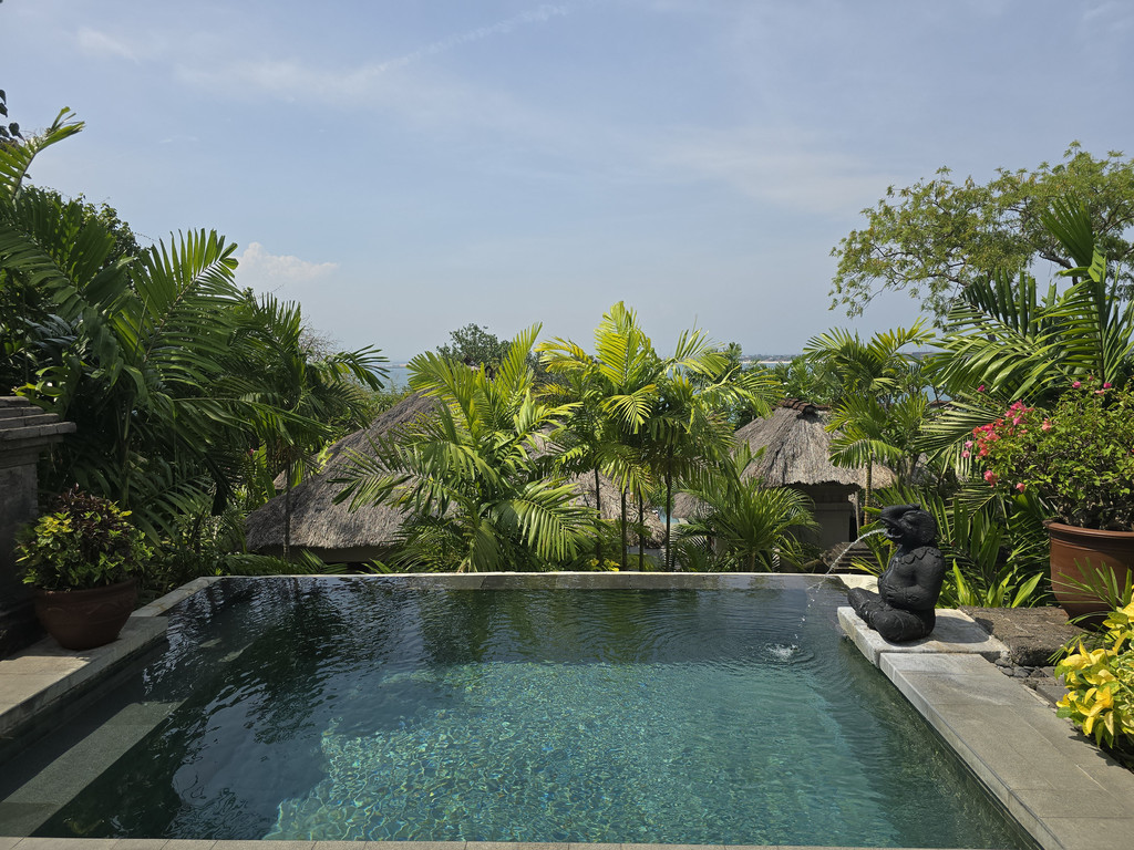 除了这两个活动,白天其他时间我们大多在泳池度过,度假村的主泳池同样是远眺整个金巴兰海湾,因为位置更高,可以看到的景致反而更多,配合无边泳池,似乎人在海中。主泳池下方还有一个小瀑布和按摩池,小瀑布的水打在身上还是有点重量的,按摩池的水还是温的,很容易就会坐在水里打瞌睡了。泳池边的躺椅和床垫都是舒适的,只要你准备使用,就有酒店职员过来帮忙铺设,还提供冰水,可以看到阳光但是又基本被遮阳伞保护,和微微轻抚的海风,同样都是催眠的好手段。我们在水中和躺椅间不时切换,竟然也就过去了不短的一段时间。