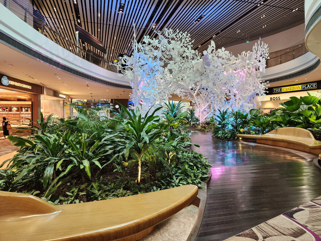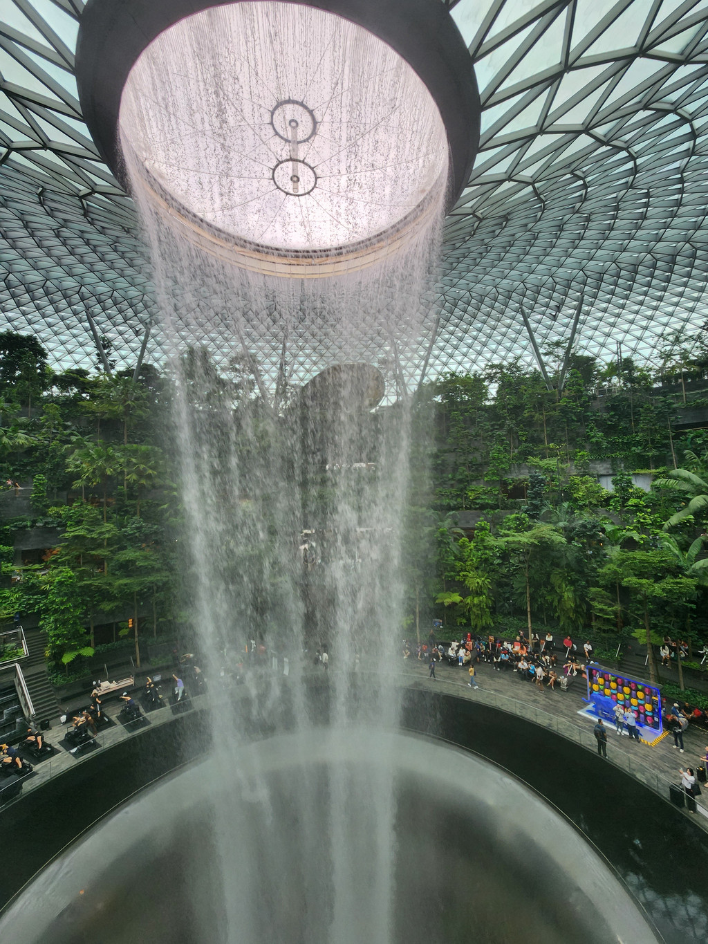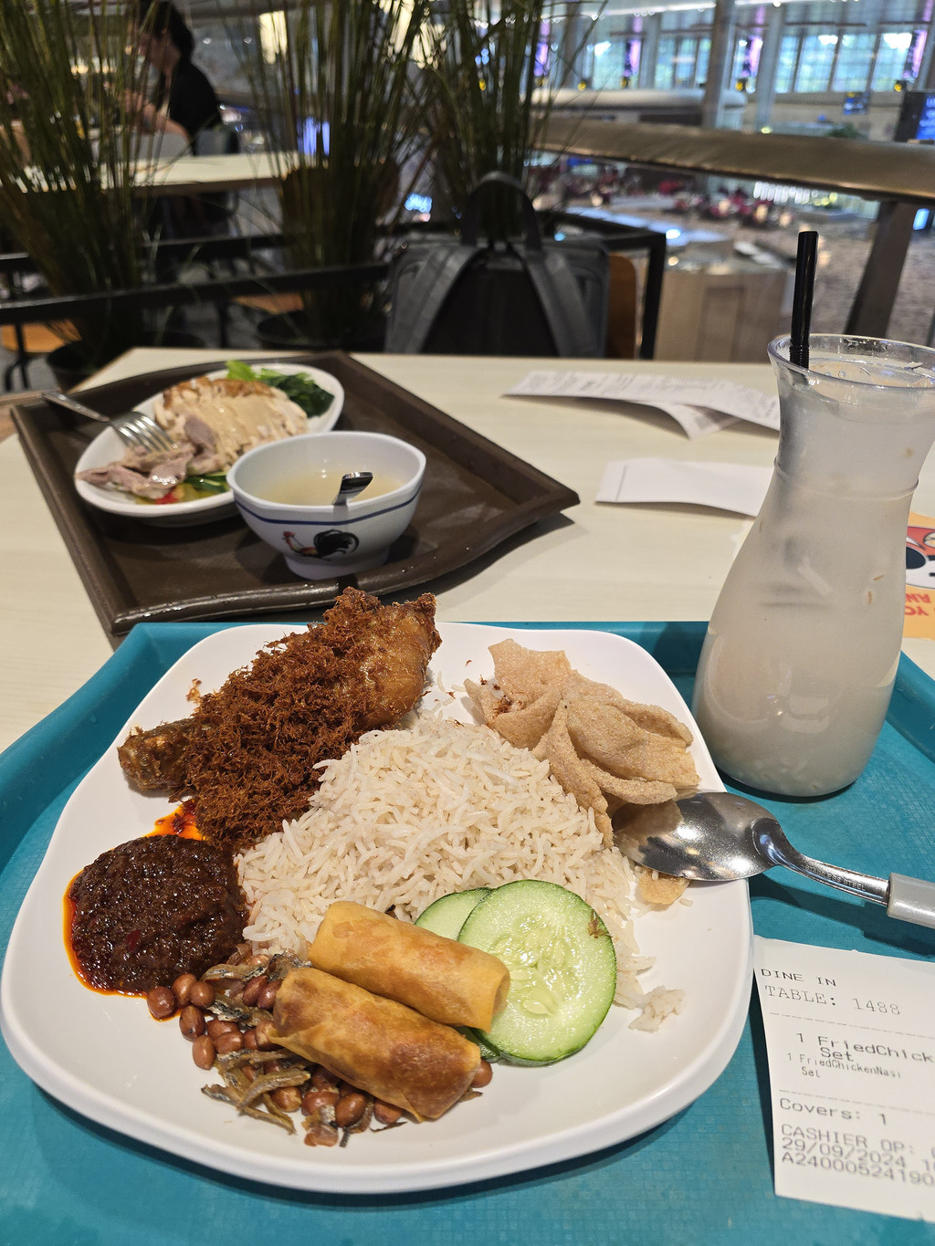 新加坡樟宜机场依旧在扩建和增添新的景致,虽然本来就已经是一个可以游走一整天的地方,乘坐T2航站楼Station E和T3航站楼Station B之间的Skytrain就可以不出机场看到目前世界上最高的室内天幕瀑布,Rain Vortex,虽然只是短时间的惊鸿一瞥,但还是很震撼的。在Old Chang Kee享用一个简单的午餐,价格还算是实惠的,炸鸡翅外皮酥香,但是内里还是嫩滑有肉汁的,蝶豆花椰浆饭里面配的小鱼干和花生都香脆可口,大大增加了饭的口感和风味,比椰浆饭本色更出色,因为椰浆的味道不算特出,不过添加了蝶豆花的蓝色,令饭的颜色还是很漂亮的。