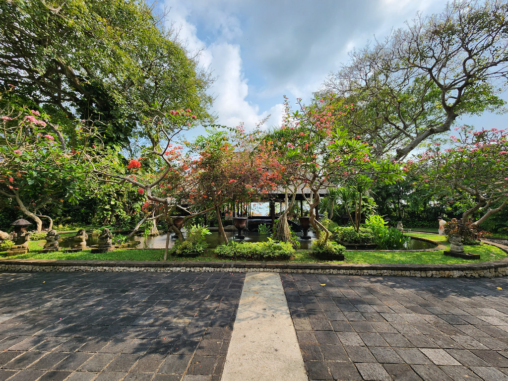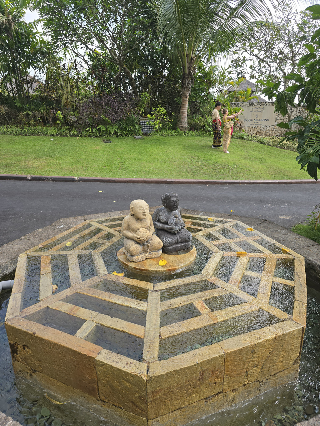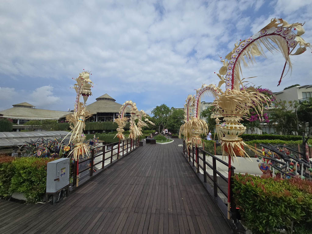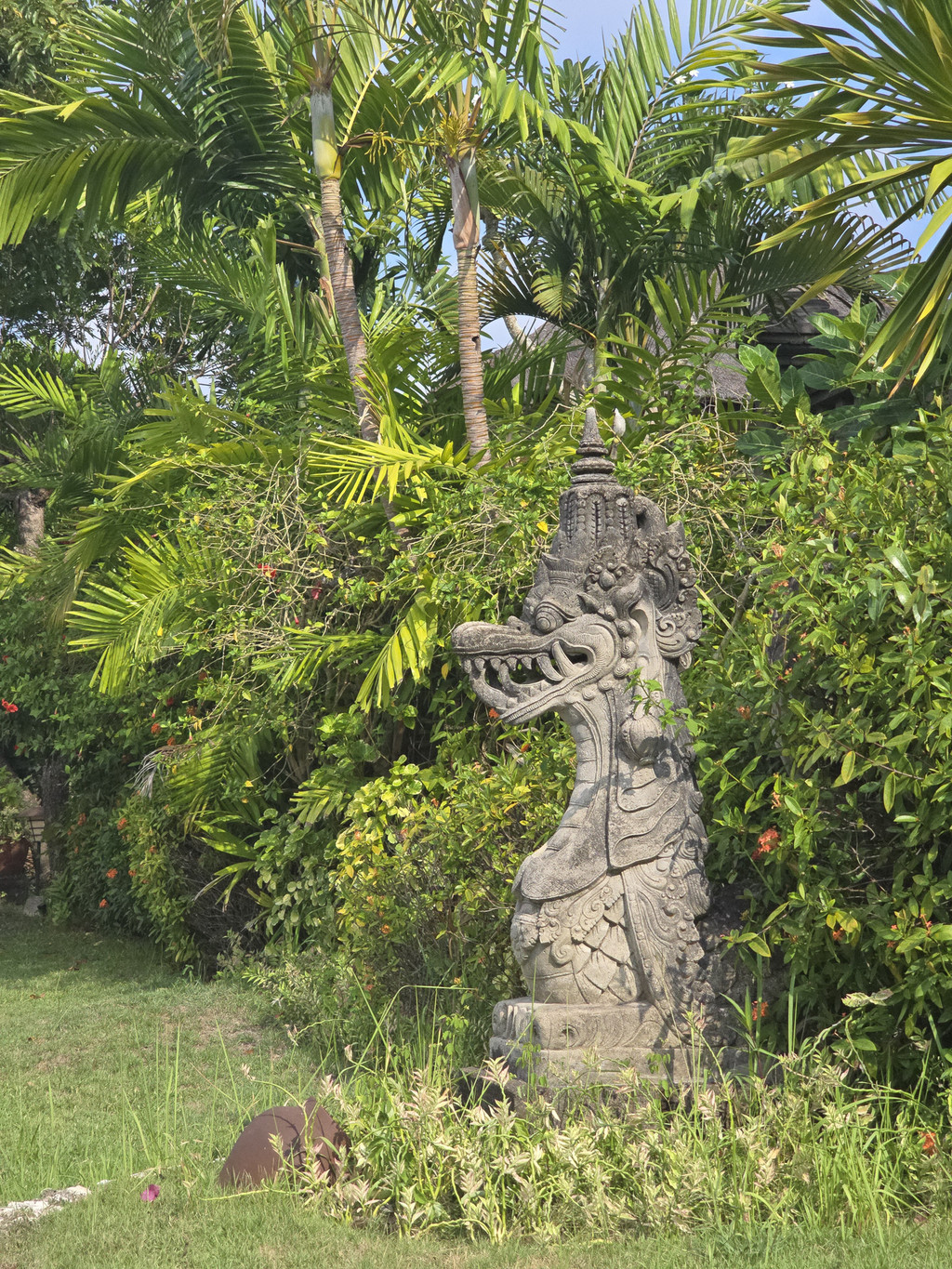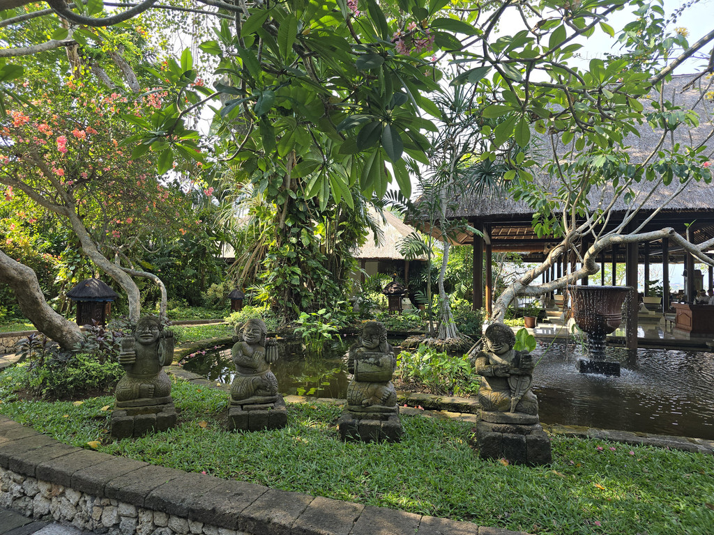 第四天,今天继续参加度假村内的介绍本土文化活动,早上是介绍度假村范围内的神像,时间还会说明其作用和之于巴厘岛印度教中的意义,约一小时的漫步介绍了不少的神像和相关宗教知识,有一些概念和中国的方位风水类似,度假村内还有一处巴厘岛印度教和佛教神像同存的区域,真正的宗教和谐与平衡,也是在度假村修建之前已经存在的。早上的阳光只有偶尔出现,大部分时间都有云遮挡,还算不太热。下午是介绍度假村范围内的一些艺术石像,这些并不是神像,而是反映巴厘岛曾经的历史文化的古老作品,可以从中了解一些当时的生活情况和文化习惯,通过介绍和分享,我们了解到很多关于巴厘岛的曾经,也见证亚洲地区对于龙和狮的崇拜似乎有所共识和联系,如果没有相关介绍,我们只会以为这些都是装饰品而已,大多会被略过,通过介绍才会知道这些承载过的历史。下午基本都是顶着烈日暴晒,虽然没有走多久多远,但是基本都是走几步就全身湿透的感觉。