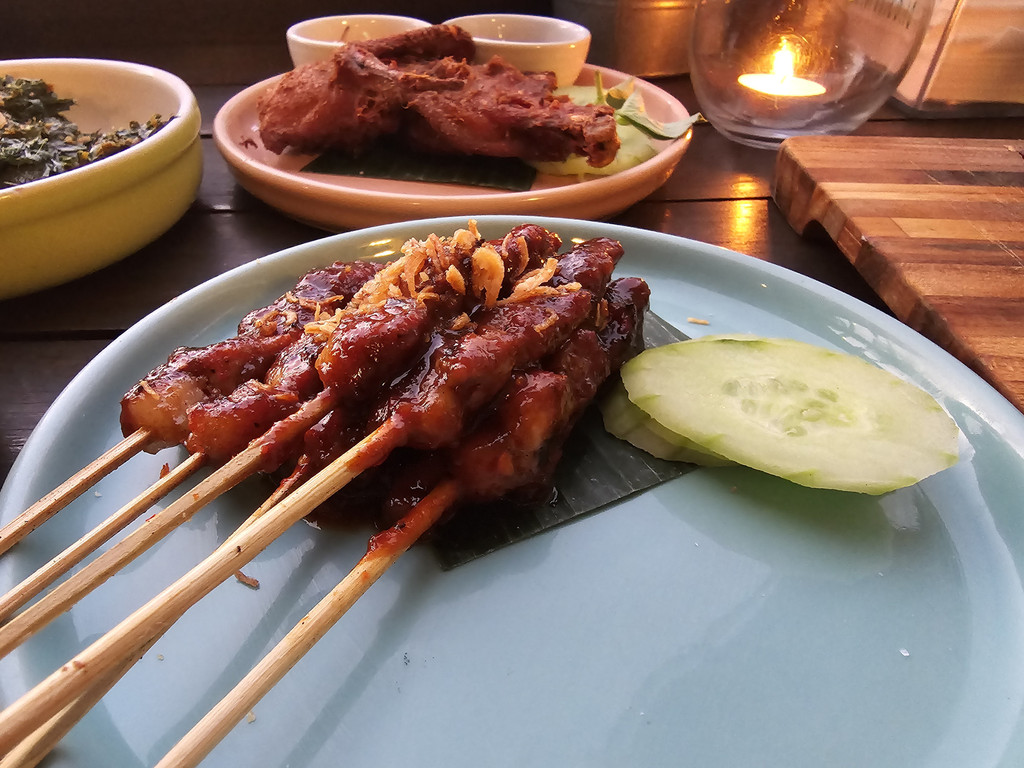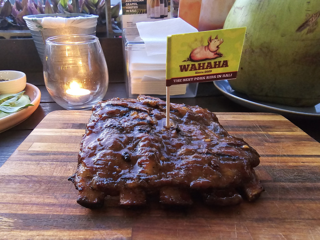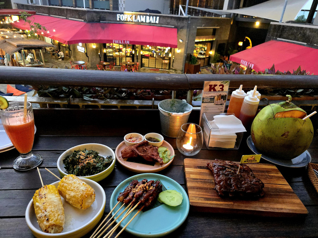 我们在Wahaha Pork Ribs Jimbaran享用晚餐,两层楼主虽然分了室内室外,同样都是没有冷气的,只是室内有吊扇,但是二楼室外可以观赏到巴厘岛传统舞蹈表演,自然比室内更好。这里的餐品是一起上菜的,饮品会略微早点。饮品出品中规中矩,没有多少惊艳的,Fresh Coconut 没有冷藏过,甜度比较一般,但是水分很足。Housemake Lemongrass Tea,茶底太甜了,基本没有茶的本味了。Bali Coffee,没有感受到有什么特别的咖啡豆味道,而且中间包含的咖啡浓度太低,只是价钱比较实惠。Lemon Ginger,柠檬的酸度反而更好地作为消食的饮品。Sate Babi,猪肉粒肥瘦相间进整条肉串的口感变得很好,肉质并不会干柴和肉汁能保存在每一口咬在肉粒之中,搭配巴厘岛的甜辣酱,更添风味,只是对于我们而言辣度略高。Grilled BBQ Corn,配合Creamy Cheese,增添了玉米本来就有的香甜。Bebek Goreng Bunba Bali,鸭的表皮炸得酥脆,但是肉也同样变得柴而干,而且没有了皮下脂肪组织,更加无法令口感变得滋润。Pork Ribs,肉完全被甜口的酱汁覆盖,肉一用力撕扯就可以脱骨,肉的味道和口感都很不错,先焗后烤的猪排骨,肉入口即化的同时不会缺乏肉汁,算是对得起招牌菜的地位。 Jukut Don Ubi,可能由于巴厘岛蔬菜相对较少,这是一款经典的巴厘岛青菜,只是木薯叶太干太硬了,难以下咽,菜品本身也油水不足。