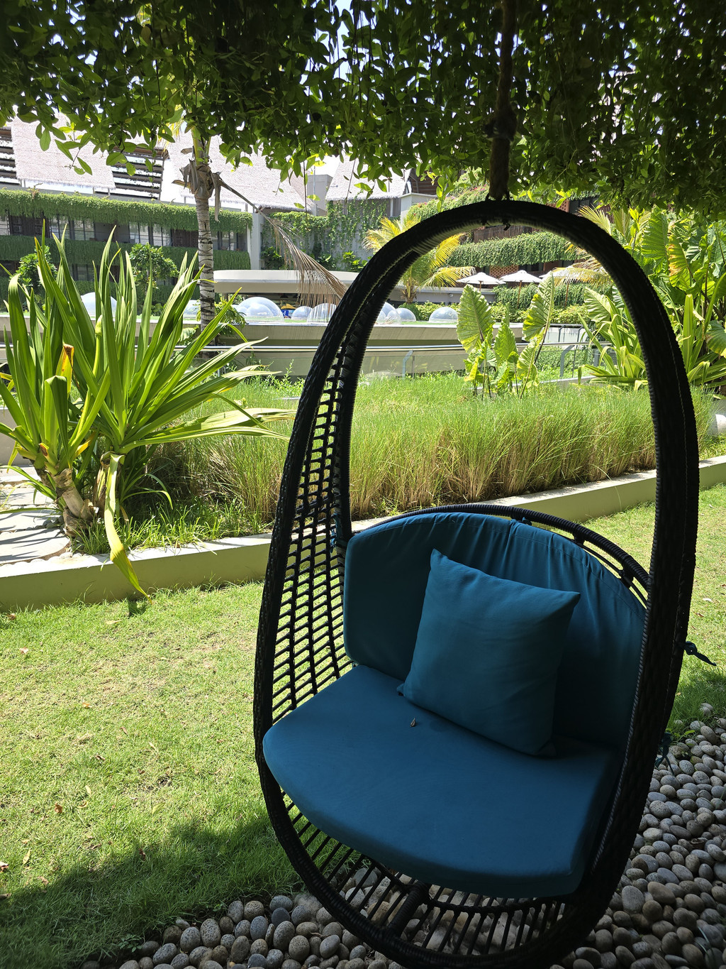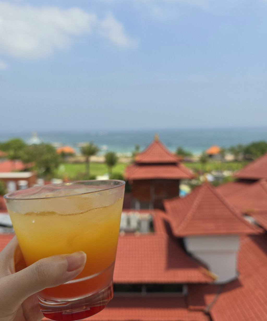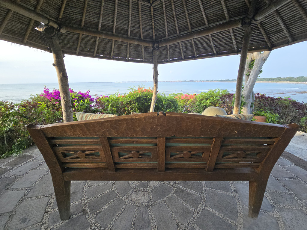 酒店的Rooftop除了无边泳池,还有个可以吹着海风,看着海的小平台,透过酒店的红色房顶,延展到酒店的草地,之后是酒店外的海滩,再到色彩变幻的海水。既可以不被阳光暴晒也可以看着风吹拂下的巴厘海卷起的阵阵白浪,热力似乎都降低了不少,只要有海风,真的可以慵懒地坐上半天。