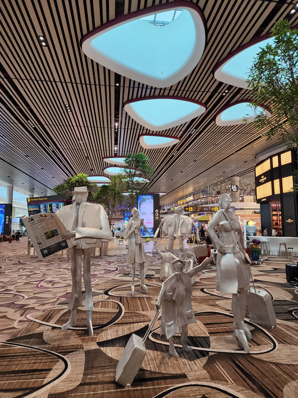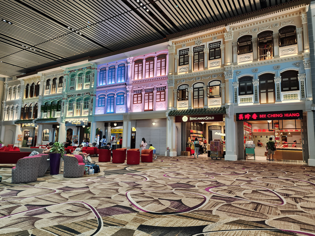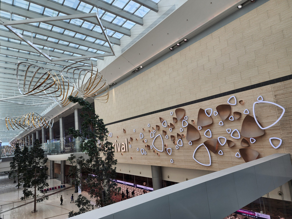 在樟宜机场中转期间,去发掘了一下最新建成的T4航站楼,由于只能通过Bus Shuttle和T1,T3连接,这里基本自成一格,餐厅,免税店,贵宾室都有,人流比其他几个航站楼少很多,感觉设施比使用者还多,特别是带充电的座位。这里有一些仿照新加坡骑楼街建筑风格的店铺,其他特色景观以现代化雕塑作品为主,感觉不如其他航站楼那种城市花园的感觉。我们在T4的International Food Hall,试了两家小店,但是肉的品质都一般,不过薏米水还算不错。