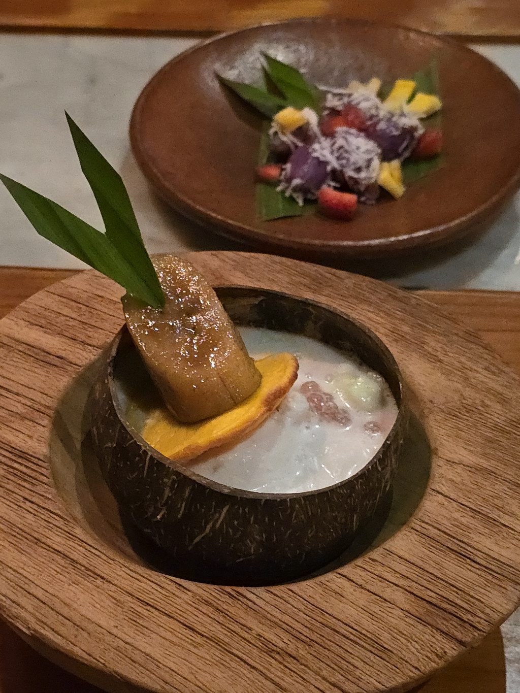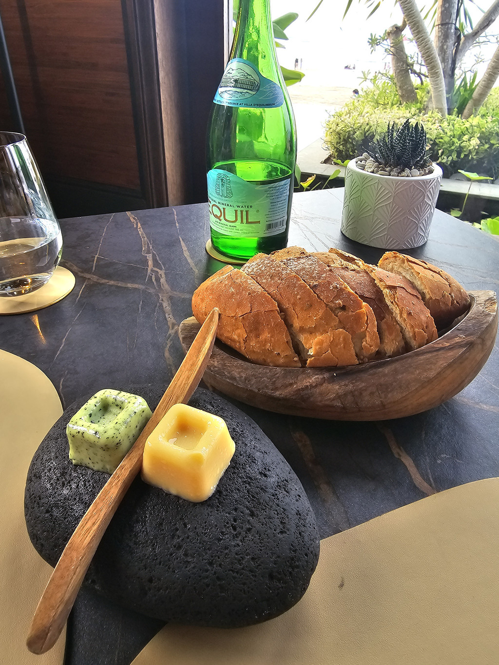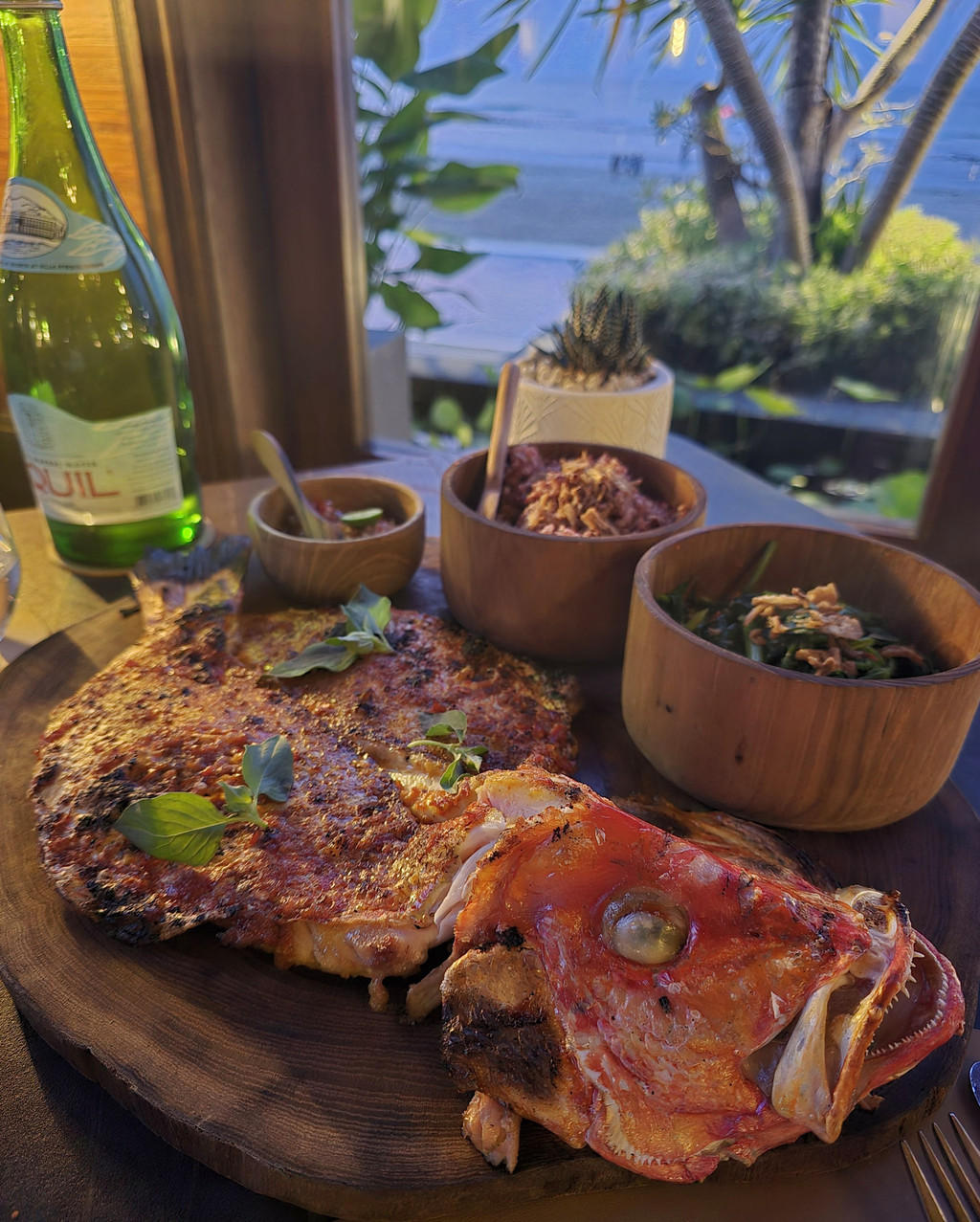 Sundara位于度假村和海滩的交界处,餐厅前面是巴厘岛目前最长的海景无边泳池,坐在这里,望夕阳西下,观平坦沙滩。这个海滩的游人明显比Pantai Jerman多很多,不过沙滩足够宽阔,并不会显得拥挤,沙的洁净程度也高很多。个人觉得最漂亮的时候是晚霞的余光映照在无边泳池之上,天地之间形成呼应,中间沙和海也带上了浅浅的颜色。无边泳池边的座位有一些住客一坐便是大半天,即便入夜依旧未曾离去,反而使用泳池的人很少,更多是将其用作背景板。职员本来安排我们在泳池边的室外座位,不过在还未抹入地平线的太阳余热和火堆的共同作用下,我们坚持不了多久便移步有冷气的室内,虽然景致被玻璃阻隔,但是热力也是。餐厅出品有点花式精致,餐前赠送的面包外脆内软,只是没再稍微烘热一下,搭配的牛油放在这里特有的黑色石头上,牛油软化程度适合刚好涂抹在面包之上。Wagyu Tataki Charred on Embers被充满烟熏浓雾的盖子遮掩着,烟熏味浓烈,和牛肉与拌菜一起吃会口感会更好,单独吃略微偏咸,不过牛肉的质感还是可以比较好的体验。Line Caught Tuna Tartar,有虾片和鱼子酱一齐增加口感的丰富度,鱼肉的新鲜度很好,反而鱼子酱一般,并未带来额外的加成。Whole Jimbaran Style Snapper有各种木质的餐具搭配,配菜和调味做得不错,鱼肉本身质量一般,略微失色。Texture of Cocoa有液氮加持的云雾缭绕,各种朱古力都不错,香气和甜度的平衡做得很好。