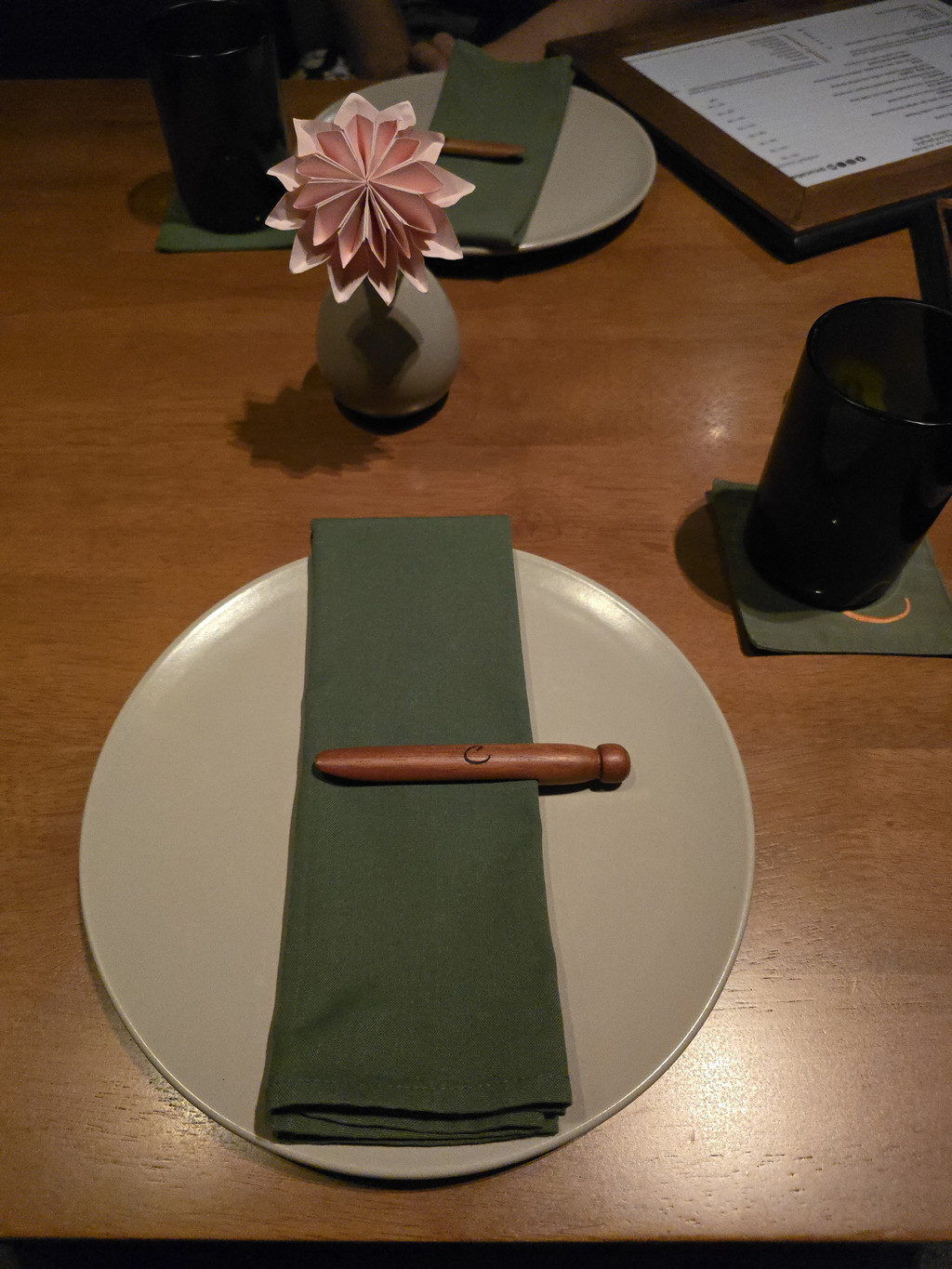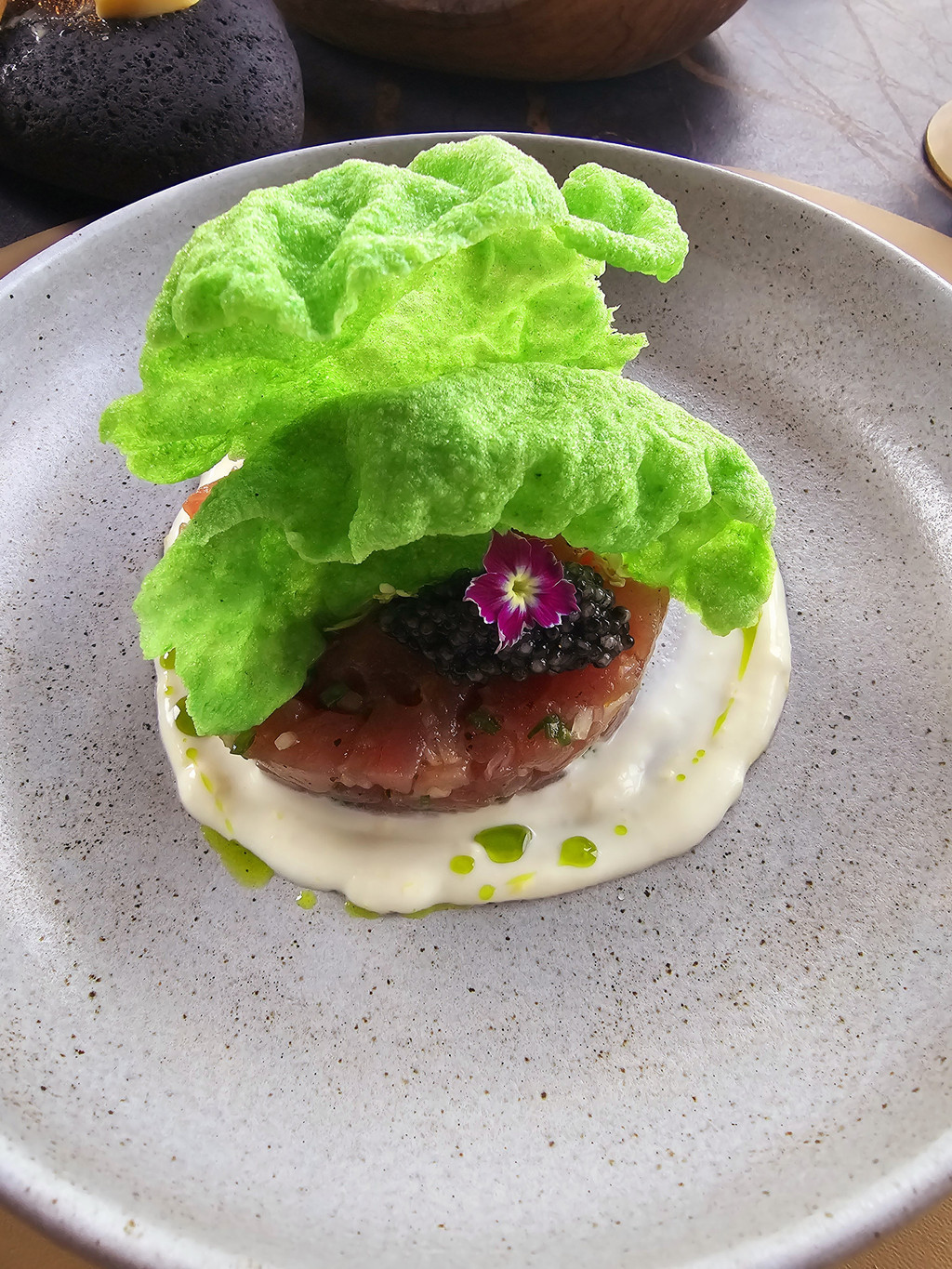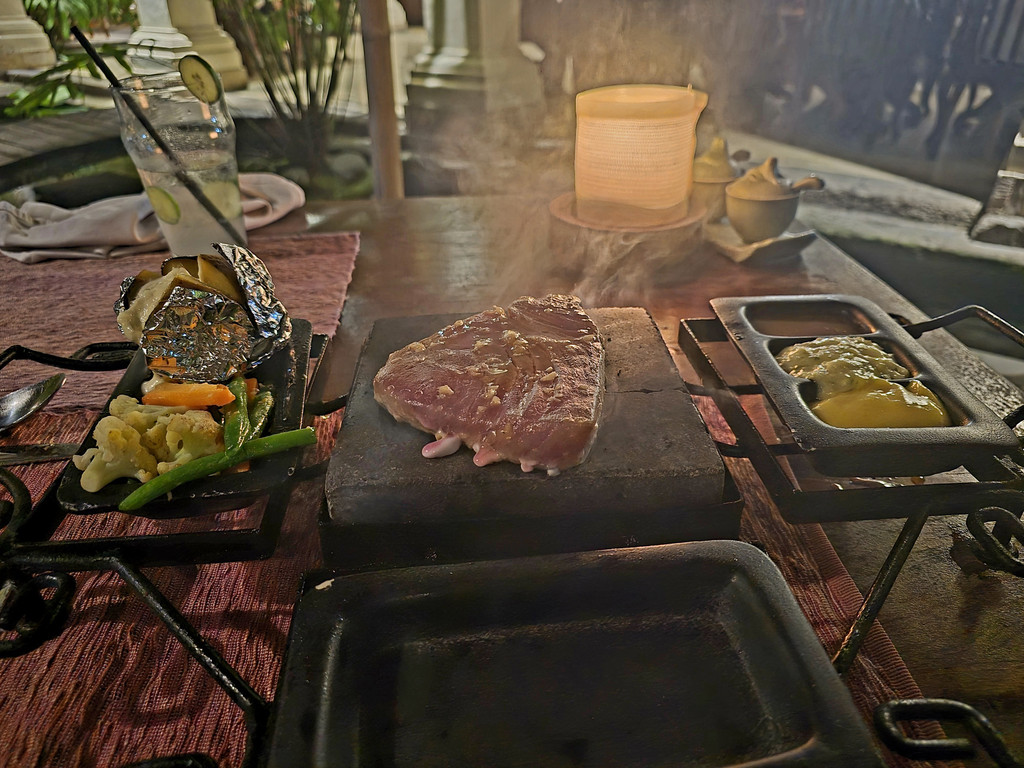 Sundara位于度假村和海滩的交界处,餐厅前面是巴厘岛目前最长的海景无边泳池,坐在这里,望夕阳西下,观平坦沙滩。这个海滩的游人明显比Pantai Jerman多很多,不过沙滩足够宽阔,并不会显得拥挤,沙的洁净程度也高很多。个人觉得最漂亮的时候是晚霞的余光映照在无边泳池之上,天地之间形成呼应,中间沙和海也带上了浅浅的颜色。无边泳池边的座位有一些住客一坐便是大半天,即便入夜依旧未曾离去,反而使用泳池的人很少,更多是将其用作背景板。职员本来安排我们在泳池边的室外座位,不过在还未抹入地平线的太阳余热和火堆的共同作用下,我们坚持不了多久便移步有冷气的室内,虽然景致被玻璃阻隔,但是热力也是。餐厅出品有点花式精致,餐前赠送的面包外脆内软,只是没再稍微烘热一下,搭配的牛油放在这里特有的黑色石头上,牛油软化程度适合刚好涂抹在面包之上。Wagyu Tataki Charred on Embers被充满烟熏浓雾的盖子遮掩着,烟熏味浓烈,和牛肉与拌菜一起吃会口感会更好,单独吃略微偏咸,不过牛肉的质感还是可以比较好的体验。Line Caught Tuna Tartar,有虾片和鱼子酱一齐增加口感的丰富度,鱼肉的新鲜度很好,反而鱼子酱一般,并未带来额外的加成。Whole Jimbaran Style Snapper有各种木质的餐具搭配,配菜和调味做得不错,鱼肉本身质量一般,略微失色。Texture of Cocoa有液氮加持的云雾缭绕,各种朱古力都不错,香气和甜度的平衡做得很好。