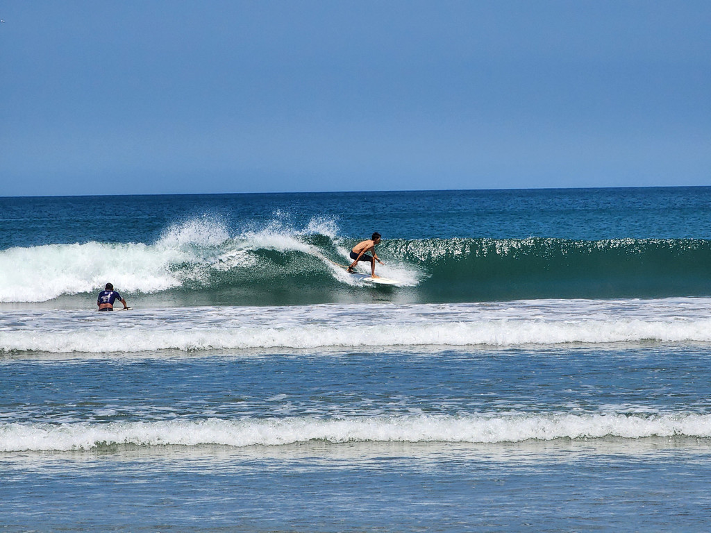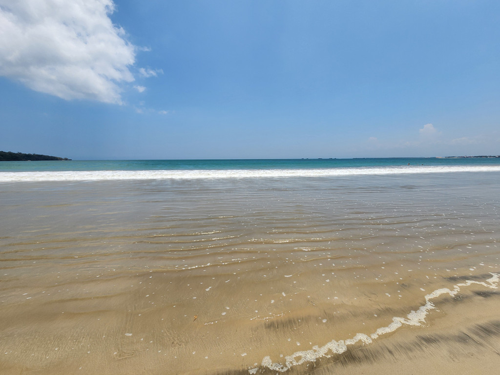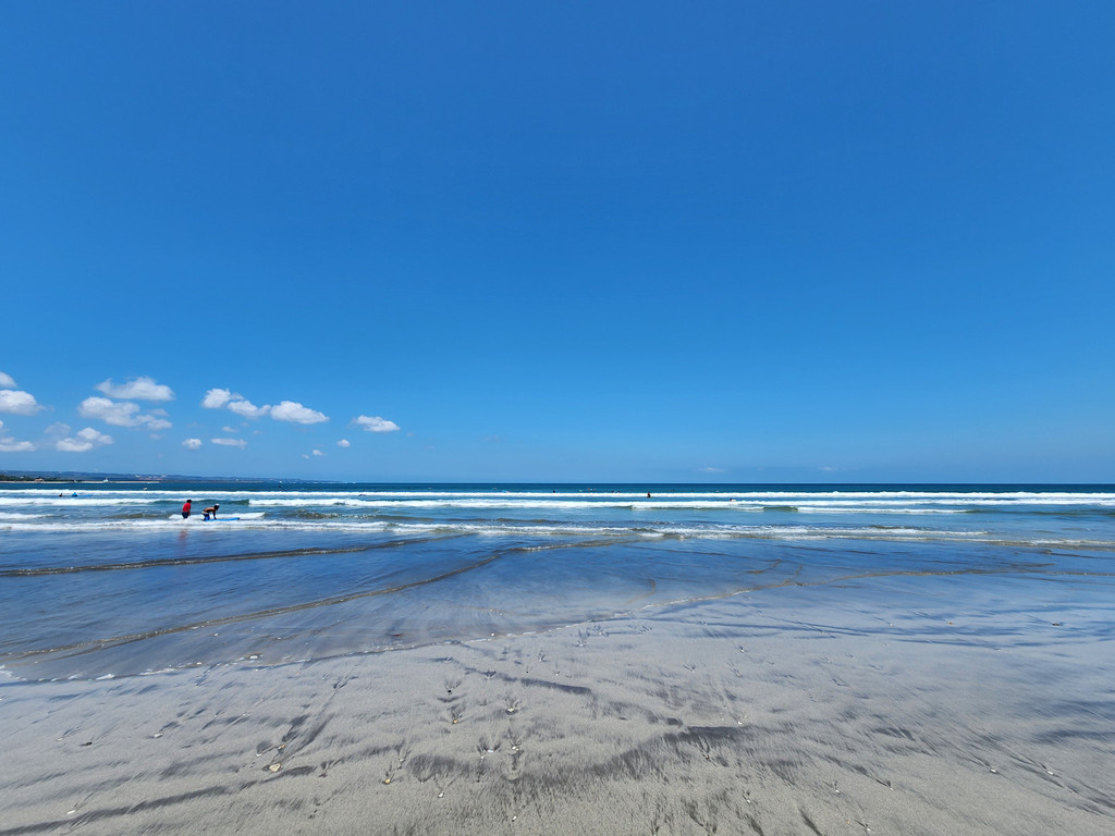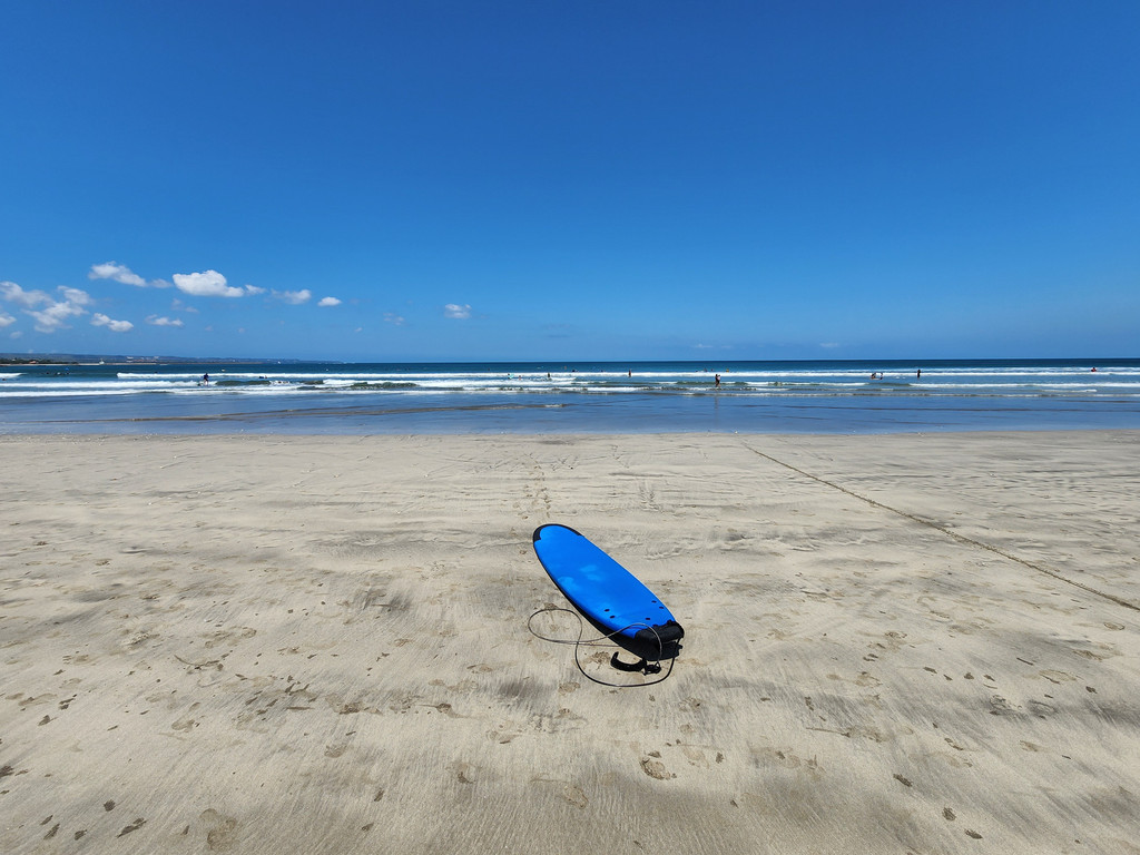 早餐过后,看看白天的库塔沙滩,天边一丝云彩都没有,巴厘海的海平面彷佛直接消失在了天际。今天刚好有冲浪比赛,应该不是太高等级的大型赛事,但是我们还是能看到一些选手可以在海浪顶端做着各种动作,另外大会安排的长枪短炮除了在主席台旁,还直接架设在海水之上。