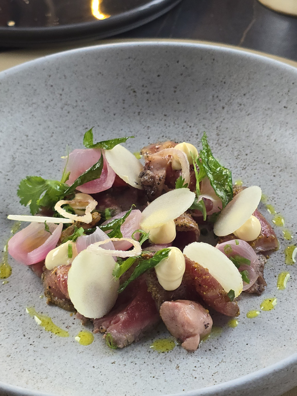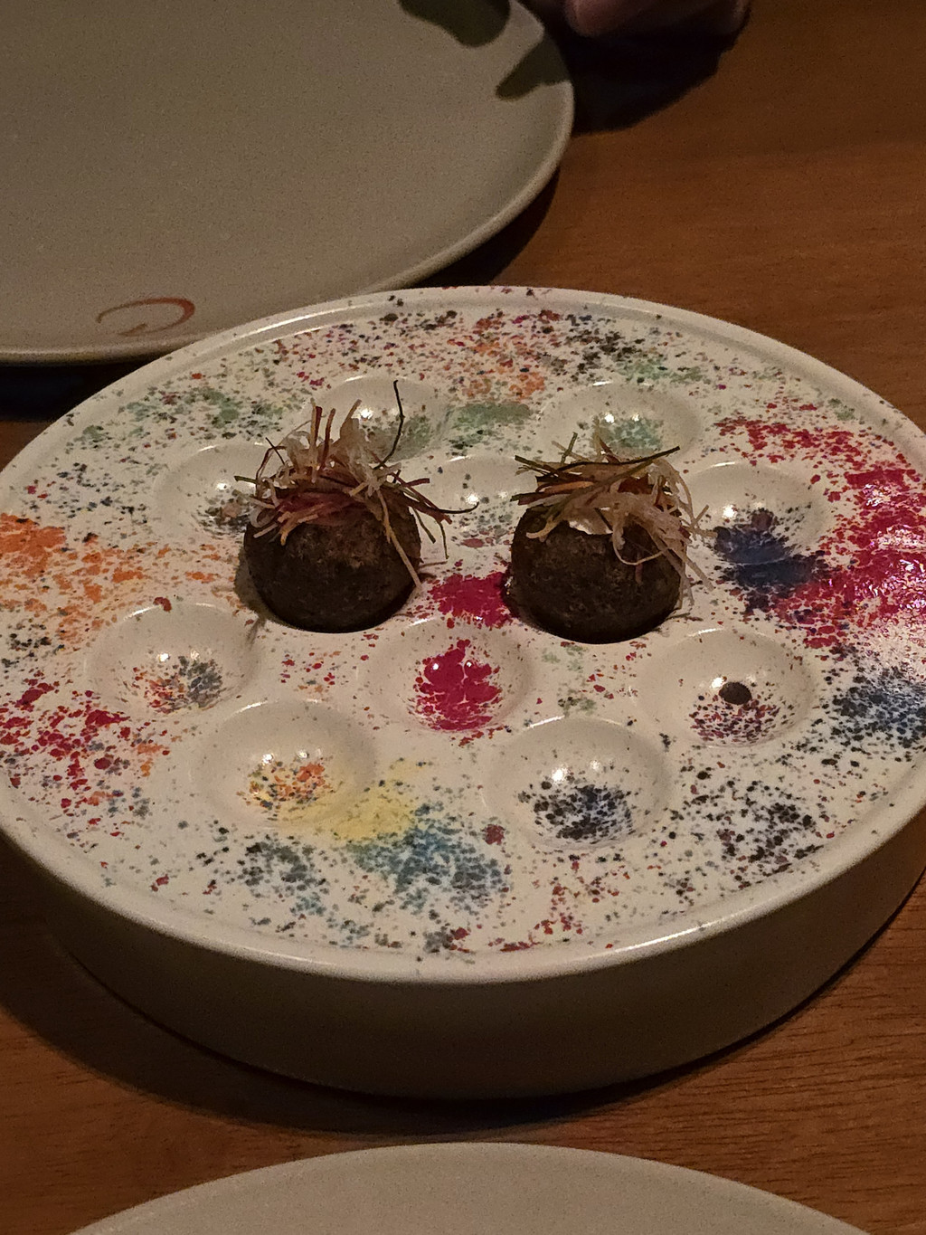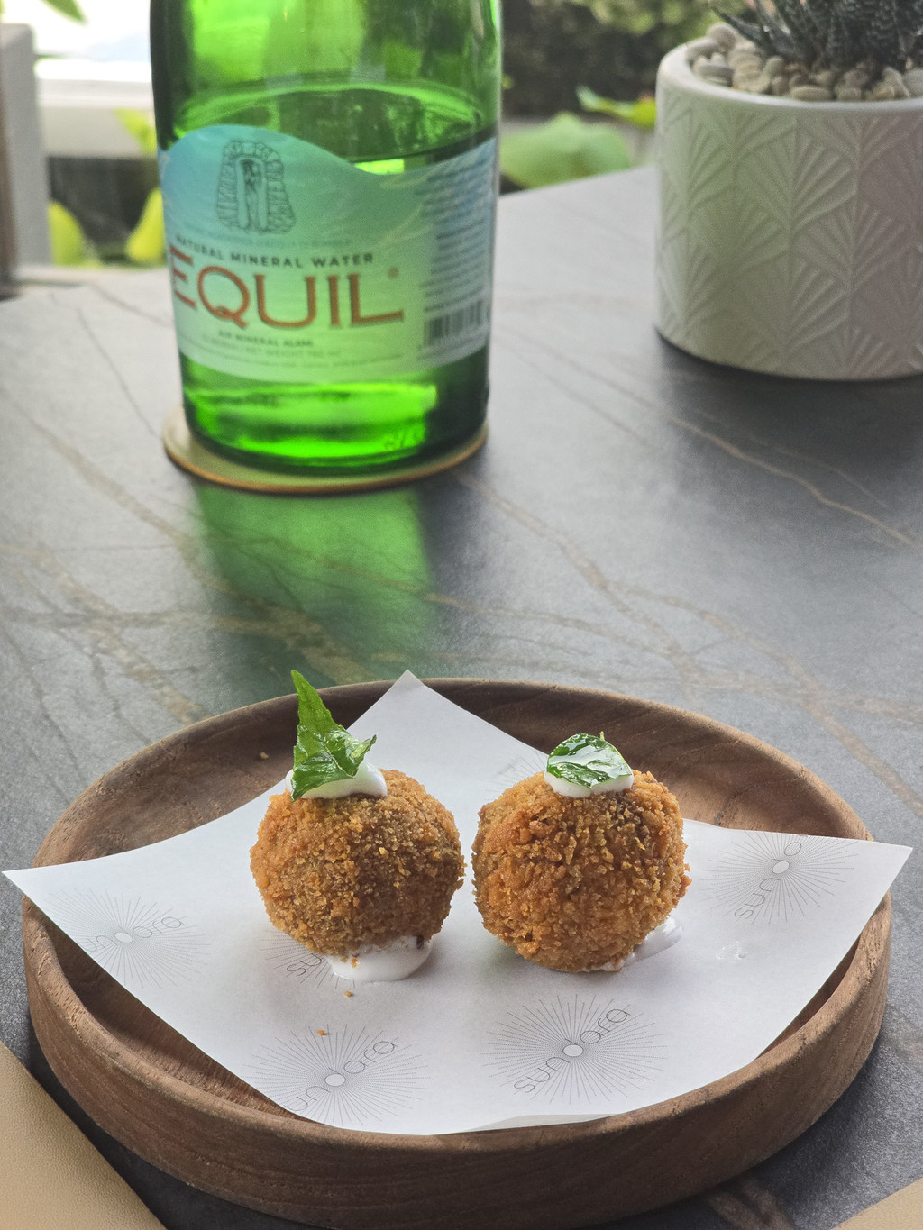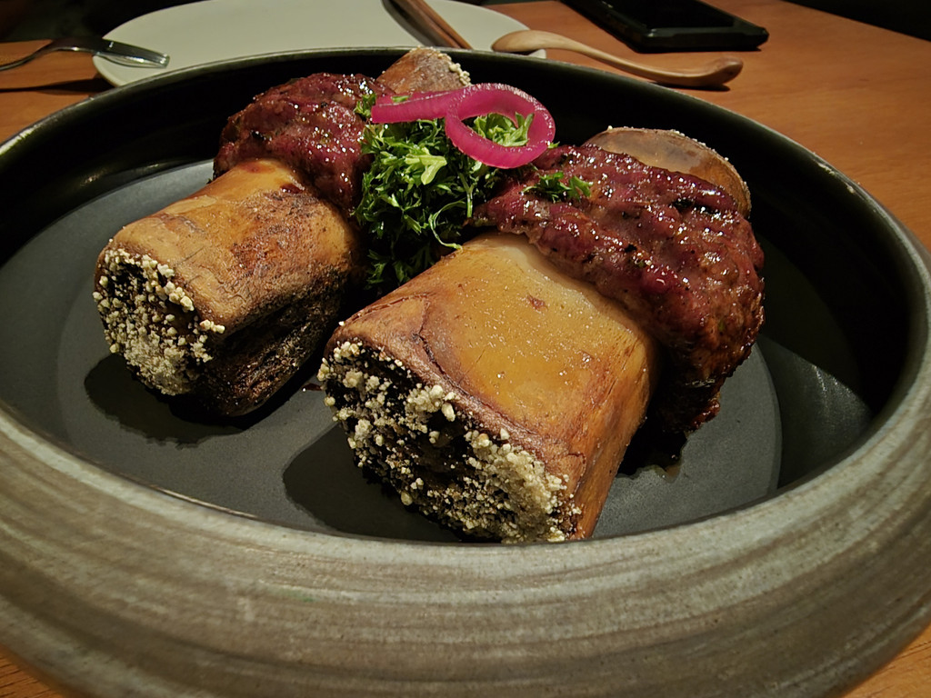 晚上我们前往金巴兰区域内评价最高的西班牙小食餐厅Cuca Restaurant,室外环境很舒适,经过一个长长的水池才会进入餐厅室内,就餐客人不少,室内外都是,餐具和座椅都有明显的餐厅名字印记,室内每个桌子之间相隔很远还有活动帘子可以分隔,餐厅职员在收拾桌椅时会主动拉上。这里所有鸡尾酒都有同款的无酒精版本,尝试了Coconut Ice,主体被冻成了冰沙,随着晚餐进程慢慢融化,冰沙混合了椰子水和青柠,不过只是微酸,这种微酸和椰子水的清甜搭配得不错。这里虽然跟随了西班牙小食的分享方式,但是这里的食物基本都是等你都享用完再上另一款。附送的餐前小吃,充满空气感,看起来是一个不小的圆球,但是除了表面的类似梅粉味道的部分,其他即便入口了也不得其物。Lucky Oyster选用的生蚝不算太大,新鲜甜滑,海水味不算太重,淡淡的刚好调味,但是柠檬汁做成的珍珠模样,样子大于食用方便。Potatoes in Delhi,就是一个土豆泥丸子配了一点辣椒酱,呈现的盘子比食物本身更出彩,所谓的咖哩味道几乎感受不到,而且略咸。Roasted Pork Buns,美式松饼包裹着BBQ的猪肉,感觉搭配很奇怪,而且烧烤后的猪肉略干,肥瘦比例不好,没有太多油脂可以和松饼和伴菜相互配合,整个出品不是一个整体。Cold Smoked Butterfish,将烟熏鱼片与甜菜优格和西葫芦片混合在一起食用,第一口的时候感觉烟熏味太重,鱼肉只剩下滑溜的口感,不过第二口还是能感受到一点鱼肉本身的鲜甜,优格作为调味酱配合西葫芦片的青涩,意外地增加了食物的口感丰富度,可以糅合成一个相互统一的味道。BBQ Octopus,鱿鱼意外地软糯,好吃得不能停口,反而烤白菜花感觉和鱿鱼并不是一个菜品,基本都是分开吃的。Spicy Crab,炸得酥脆的软壳蟹,似乎已经是最好的呈现方式,搭配的酱汁,初入口似乎只有微辣,但是回味很特别,有种复杂的微辣和微甜的混合。The Beef Bone,巨大的牛骨中间是糯米饭,牛骨和上面的牛肉一起烤熟,牛肉和糯米饭搭配一起才会比较好吃,单独吃其中一样总有种口感上的不足,但是牛肉选择的偏瘦,虽然烤的火候掌握得相当,没有令牛肉变得干柴,但是依旧缺少油脂。