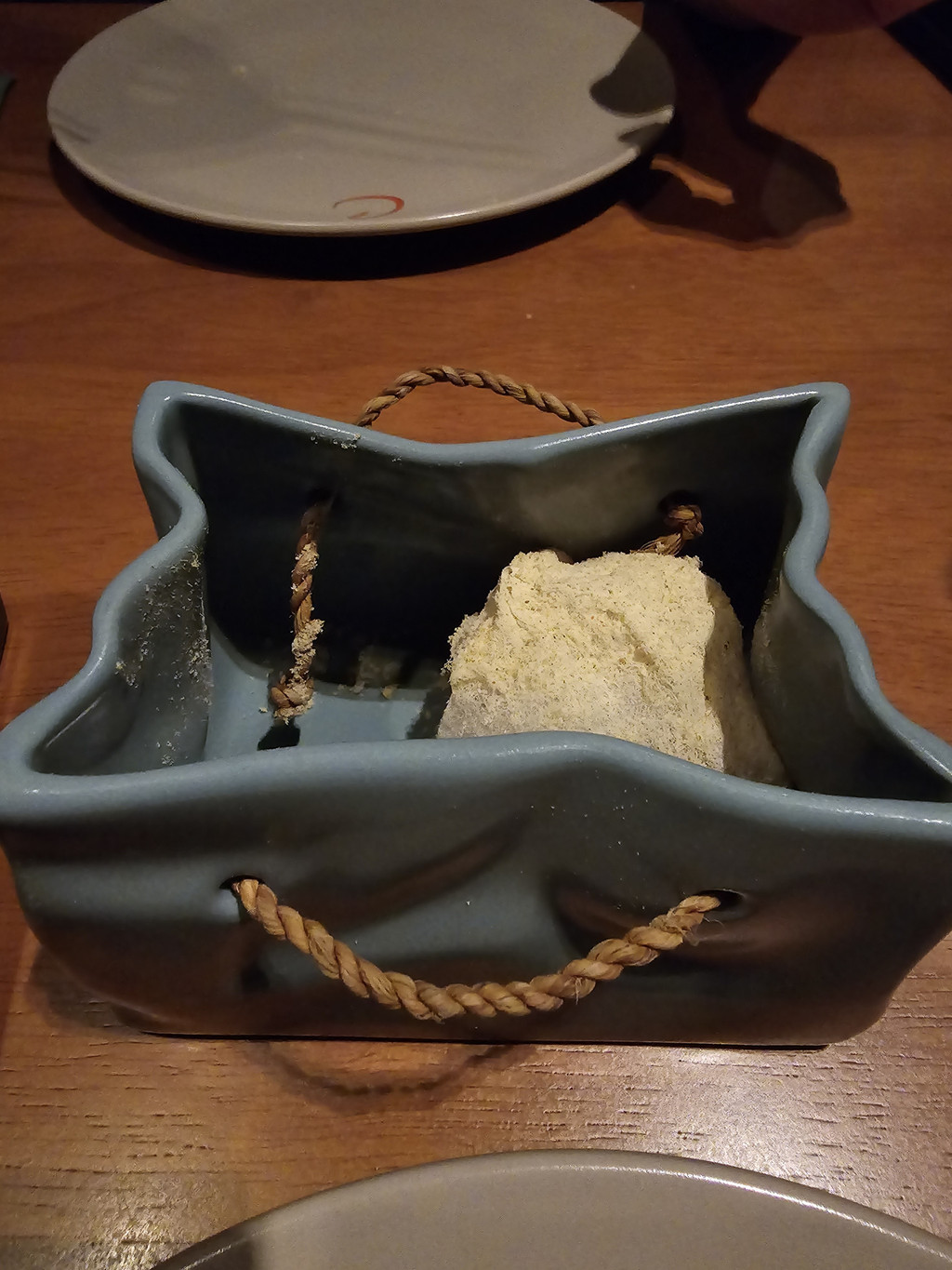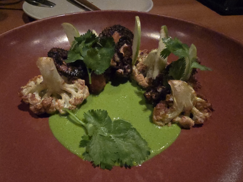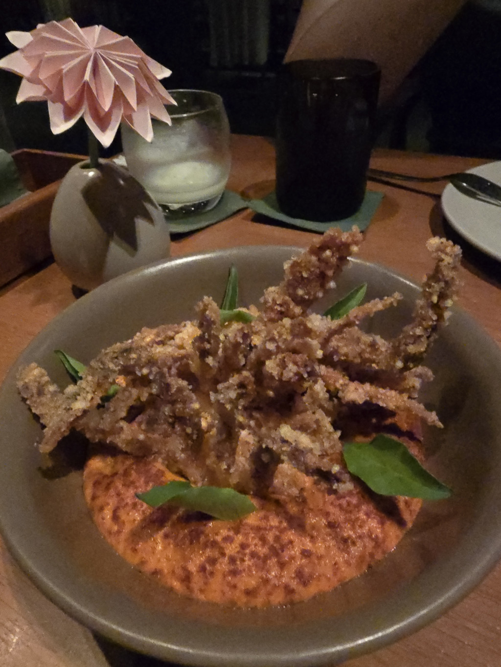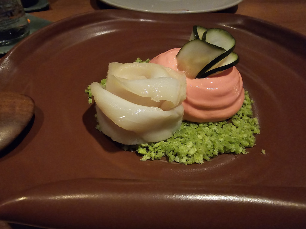 晚上我们前往金巴兰区域内评价最高的西班牙小食餐厅Cuca Restaurant,室外环境很舒适,经过一个长长的水池才会进入餐厅室内,就餐客人不少,室内外都是,餐具和座椅都有明显的餐厅名字印记,室内每个桌子之间相隔很远还有活动帘子可以分隔,餐厅职员在收拾桌椅时会主动拉上。这里所有鸡尾酒都有同款的无酒精版本,尝试了Coconut Ice,主体被冻成了冰沙,随着晚餐进程慢慢融化,冰沙混合了椰子水和青柠,不过只是微酸,这种微酸和椰子水的清甜搭配得不错。这里虽然跟随了西班牙小食的分享方式,但是这里的食物基本都是等你都享用完再上另一款。附送的餐前小吃,充满空气感,看起来是一个不小的圆球,但是除了表面的类似梅粉味道的部分,其他即便入口了也不得其物。Lucky Oyster选用的生蚝不算太大,新鲜甜滑,海水味不算太重,淡淡的刚好调味,但是柠檬汁做成的珍珠模样,样子大于食用方便。Potatoes in Delhi,就是一个土豆泥丸子配了一点辣椒酱,呈现的盘子比食物本身更出彩,所谓的咖哩味道几乎感受不到,而且略咸。Roasted Pork Buns,美式松饼包裹着BBQ的猪肉,感觉搭配很奇怪,而且烧烤后的猪肉略干,肥瘦比例不好,没有太多油脂可以和松饼和伴菜相互配合,整个出品不是一个整体。Cold Smoked Butterfish,将烟熏鱼片与甜菜优格和西葫芦片混合在一起食用,第一口的时候感觉烟熏味太重,鱼肉只剩下滑溜的口感,不过第二口还是能感受到一点鱼肉本身的鲜甜,优格作为调味酱配合西葫芦片的青涩,意外地增加了食物的口感丰富度,可以糅合成一个相互统一的味道。BBQ Octopus,鱿鱼意外地软糯,好吃得不能停口,反而烤白菜花感觉和鱿鱼并不是一个菜品,基本都是分开吃的。Spicy Crab,炸得酥脆的软壳蟹,似乎已经是最好的呈现方式,搭配的酱汁,初入口似乎只有微辣,但是回味很特别,有种复杂的微辣和微甜的混合。The Beef Bone,巨大的牛骨中间是糯米饭,牛骨和上面的牛肉一起烤熟,牛肉和糯米饭搭配一起才会比较好吃,单独吃其中一样总有种口感上的不足,但是牛肉选择的偏瘦,虽然烤的火候掌握得相当,没有令牛肉变得干柴,但是依旧缺少油脂。