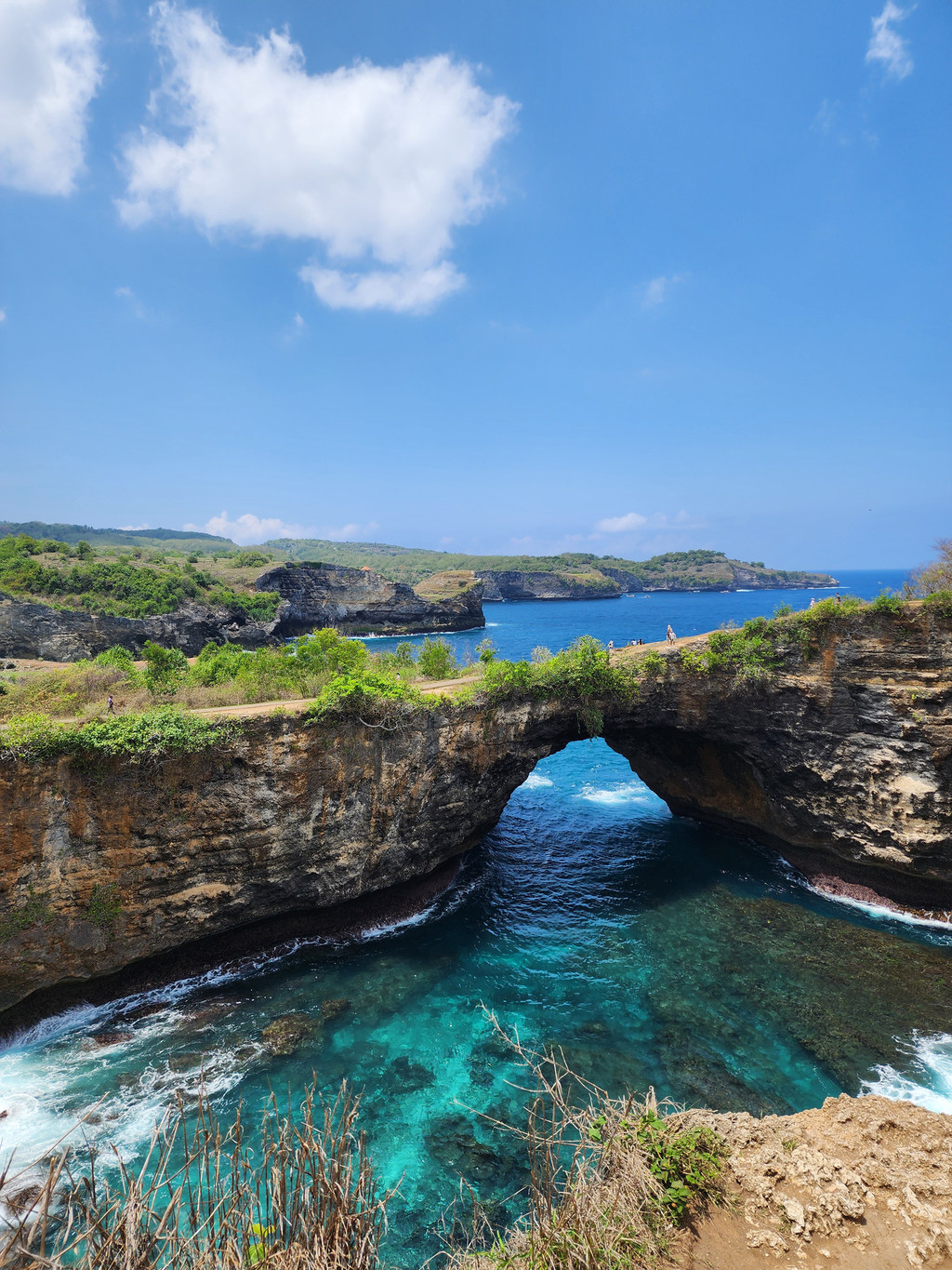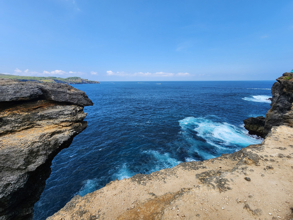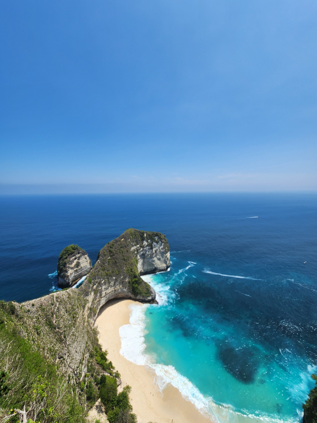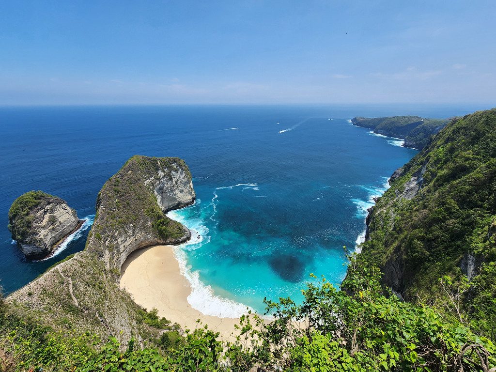 Kelingking Beach,是珀尼达岛最具标志性的地方之一。下面有巴厘岛区域少见的白色沙滩,从崖顶区域可以看到的广阔海洋,而犹如霸王龙的海滩山丘曲线是这个景点最独特的地方。不过这里正在兴建从山顶到海滩的垂直玻璃观光电梯,将来还能保留多少白色沙滩的原始就不得而知了。