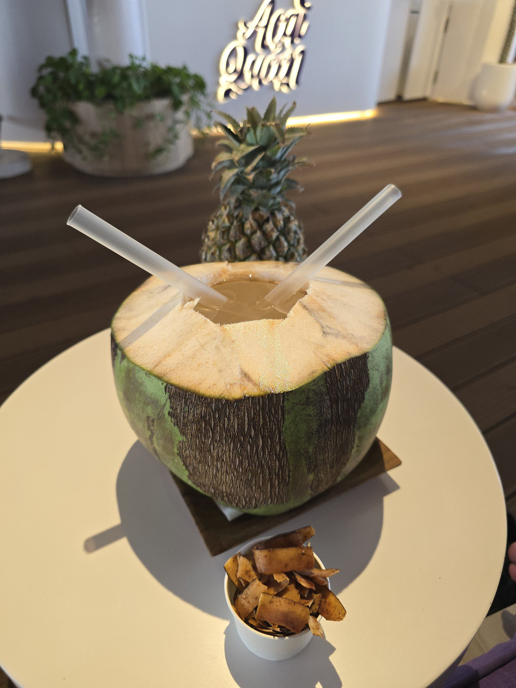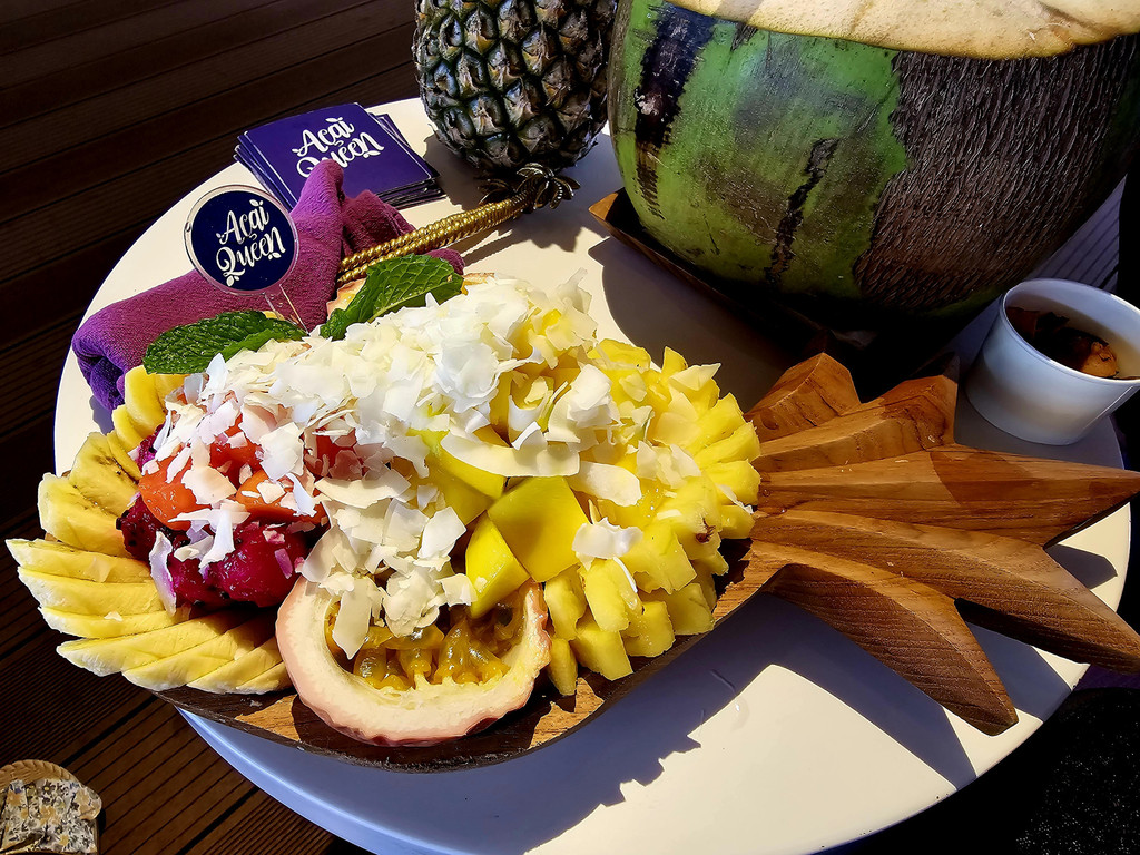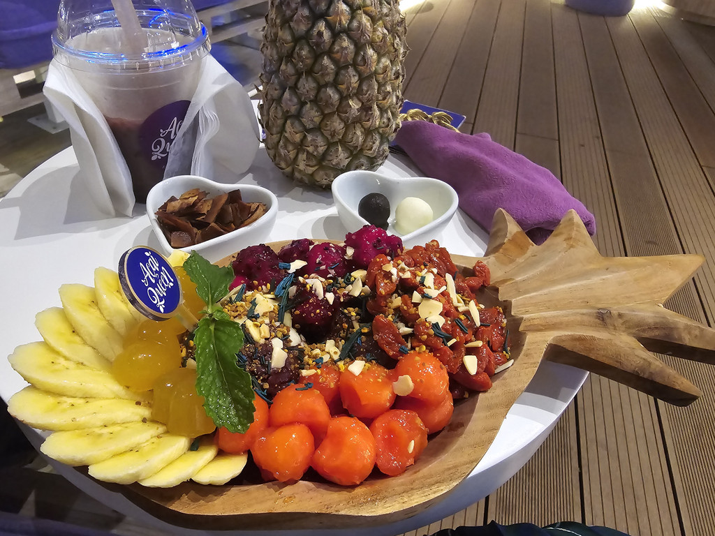 午餐后,我们到Acai Queen享用饭后甜品,主打巴西莓做的雪葩搭配各种其他食材的Acai Bowl。使用号称超级健康食物的Acai,份量还是很足的,即便是中等大小也够两人共享,用的水果质量也算新鲜甜美。不过我们在巴厘岛吃到的椰青都不甜,虽然水分很多,这里椰青会搭配一些添加了巧克力的烤椰子片,绝对的美味。但是这里的就餐座位不太舒适,餐桌太小,椅子太高,而且商场中央的开放位置,虽然布置有打卡位置。