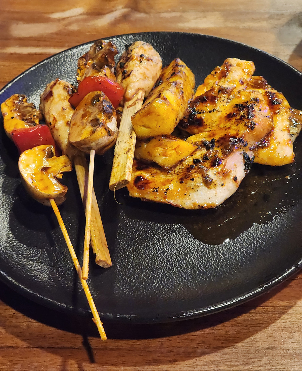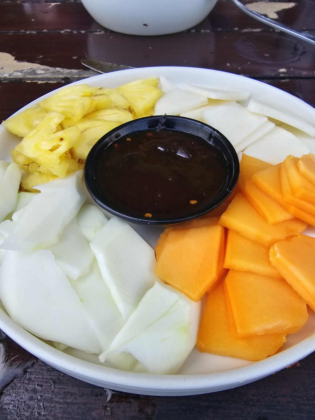 采购完成,回到酒店之后,已经比较晚了,本来我们想去旁边的一家铁板烧餐厅,但是已经满座。我们被旁边的现场乐队的高昂歌声和强劲伴奏所吸引,便在69 Bar and Resto坐下了。当我们查看菜单时,又被自助BBQ餐的价格吸引,我们自己选好想吃的,职员会现点现烤,还会送到我们的餐桌,虽然生肉和蔬果的质量很一般,种类也不过数款,但是烤菠萝和烤鱿鱼都不错,特别是烤菠萝,多汁,甜香,厨师在烧烤上涂抹的酱汁更加展现菠萝的这些特点。除了烧烤,还有一些冷盘热菜,水果甜点,都是包含在自助烧烤的价钱里面的,差不多只有酒水要额外加钱。现场音乐总是能带来更多的兴奋,不少客人会被音乐感染而到餐厅里坐坐,喝一两杯,吃点东西。