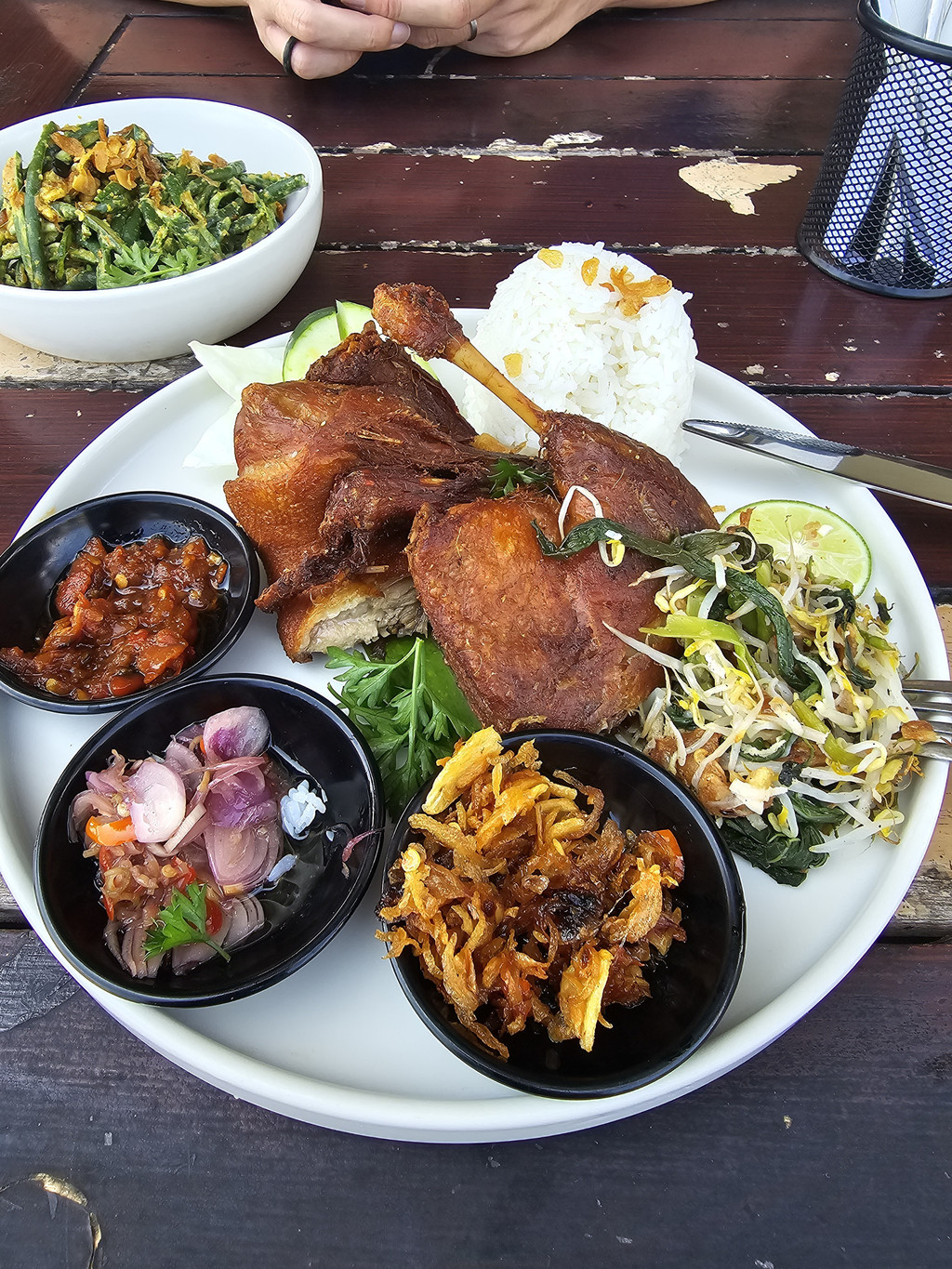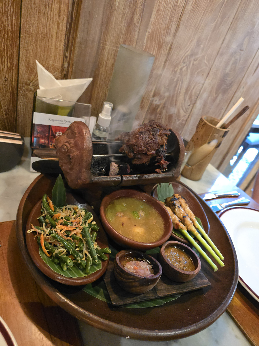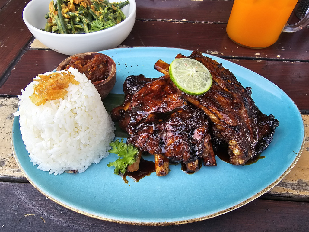 我们在Mr. Wayan by the sea用午餐,这家餐厅位于购物中心三楼,用餐的开放区域可以看到库塔沙滩外开阔的巴厘海的海湾,海风吹拂之下,只要不是被阳光晒到的地方,还是比较舒适的,美好的景致,肯定会对食物和就餐感受加分的。Bebek Megoreng,酥炸鸭子的外皮酥脆,皮下脂肪都还在,特别是鸭腿部分,肉质虽然不能说是嫩滑,但还算是细腻,鸭胸部分的肉质略微差点,毕竟本身比较少脂肪了,不过骨头也都是酥脆的。Iga Mepanggang,烤猪排骨,酱汁味道比较浓,肉也是入味的,但是肉质比较干硬,已经没有肉汁了,再熟点可能都可以变成肉干,撕成一条条了。Kacang Mekalas,用姜汁和姜蓉拌豆角,搭配比较特别,令只有豆角的菜式增加了味道,不会太清淡,而且是能够相互提升味道的搭配。Rujak,所谓新鲜当季水果,但是质量都一般,而且搭配的是辣味比较重的甜辣酱,难以理解和接受的味道。