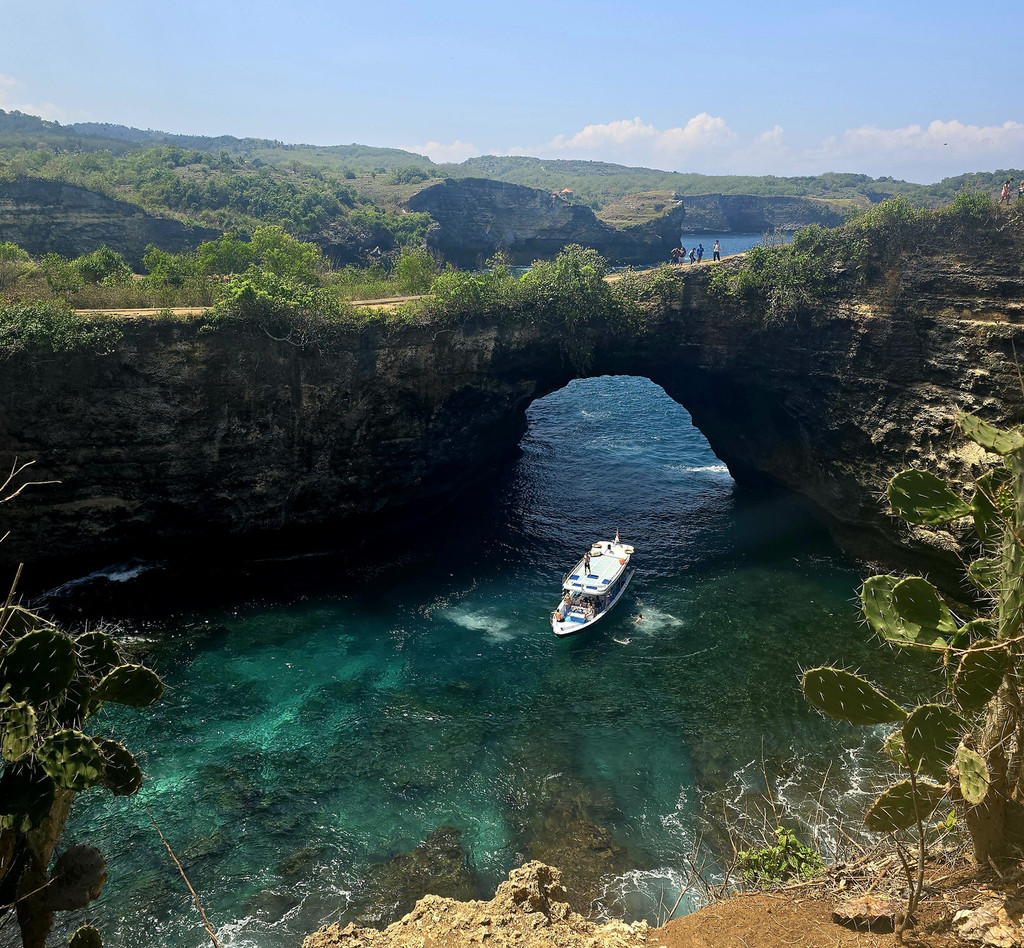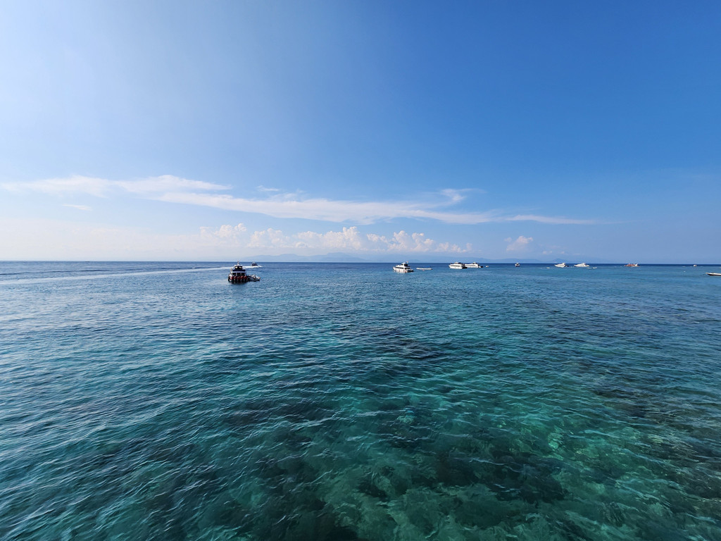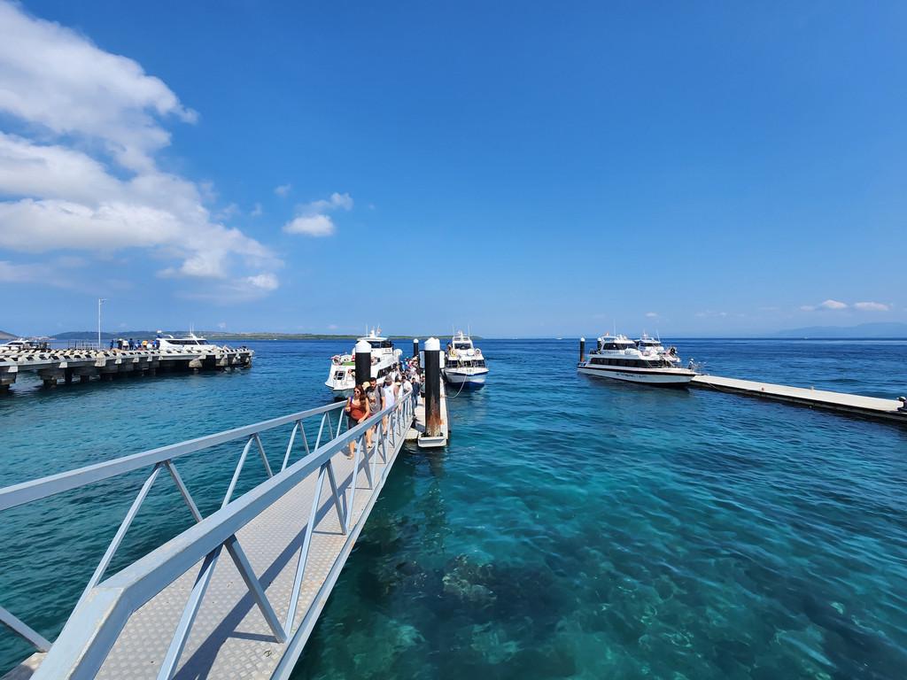 从库塔出发到Sanur Harbour,需要从西向东横穿整个巴厘岛,中间经过巴厘岛的首府登巴萨区域,刚好遇上早高峰的车流,略微有点缓慢,堵车情况还不算严重,不过也用了近一个小时才走过20公里左右的车程。码头的造型类似一艘船,上岛的人很多,我们跟随人流进入码头,整体还是井然有序的。船也有很多,虽然说是九点开船,但是满员就会开走,我们船票上的就是如此,不过很快就解决了,当然这是导游的功劳。船程不到一个小时,船也不大,满员100人左右,整个航程略微有点上下颠簸,特别是在蓝梦岛外等游人换小快艇的时候幅度较大。所谓高速快艇,其实就是在船尾安装了多个小快艇的发动机,并不是常见的高速水翼船或者双体船,所以船头和船尾会相对更颠簸。