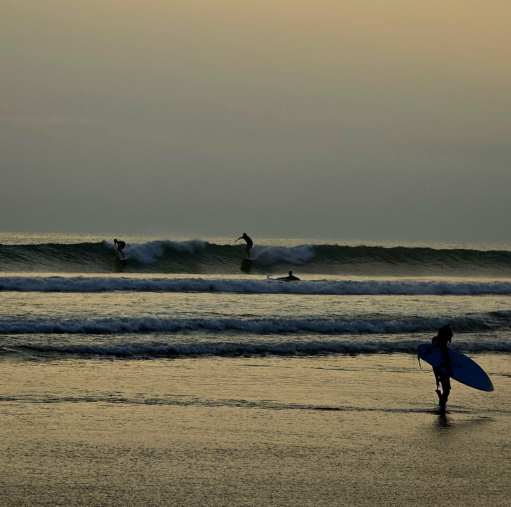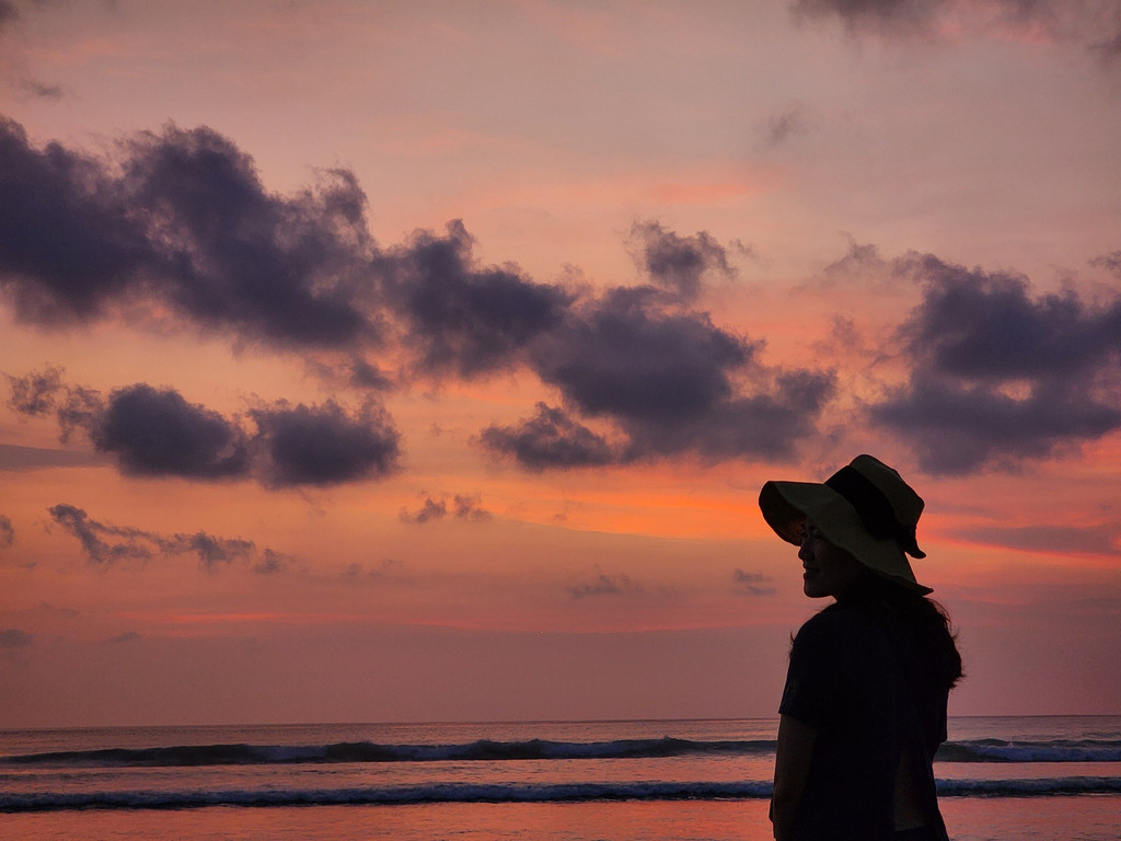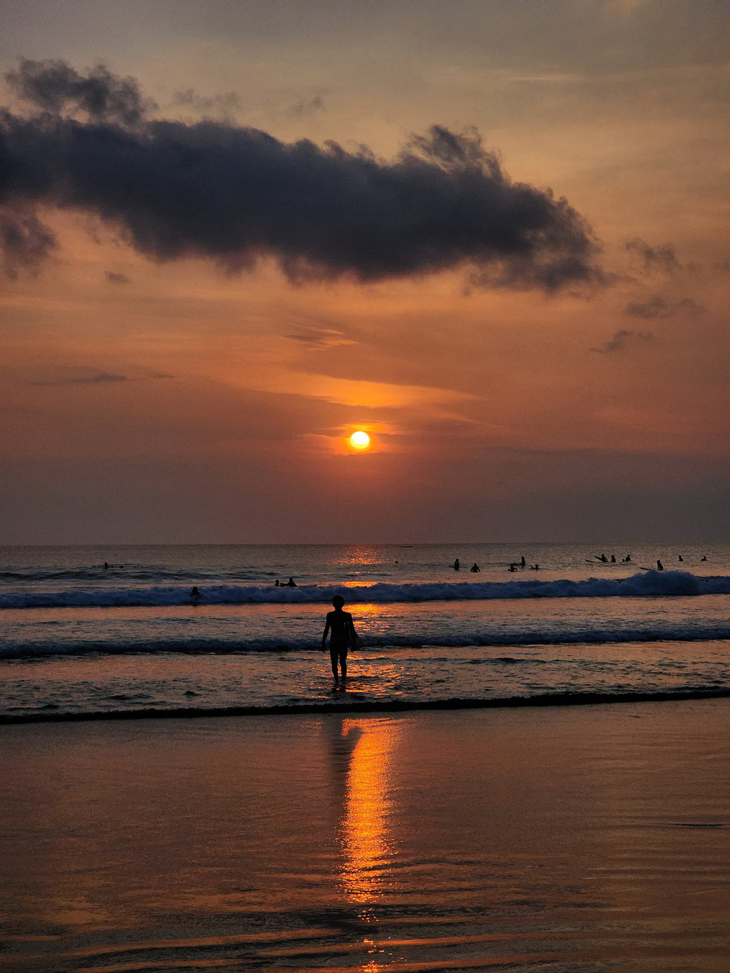 我们等下午的太阳有所消退之时,才前往库塔沙滩,这里的人流明显比金巴兰沙滩多很多,浪也明显更大,所以有很多的冲浪者。而这里也是观看日落的好位置,一年四季几乎都是比较好的观看位置。不过这里的沙,泥质更重,几乎全都是黄灰色的,白沙是不可能看到的。而周边也明显商业化严重,只要经过摊位就会被问是否需要躺椅或者学习冲浪。我们一边等着日落,一边看着冲浪人士,我们并没有向北走多少,因为远看时感觉人流更密集,另外我们也刚好在一个前面基本没有人的位置,便不想移步了,几乎在同一个地方站了近一个小时,居然并不觉得时间流逝太多,夕阳西下,总是无限美好及柔和。看着太阳沉没于海天交界的云层,从略显刺眼到成为一个橙黄色圆形,配合海上冲浪者的起起落落,随手就是一幅美丽的剪影。可惜云层太厚,没入海平面的阳光已经无力渲染整个天空漂浮的云朵,只能染红了西边的一部分天空,晚霞只有一抹亮色,海天一色的红霞未能出现。
