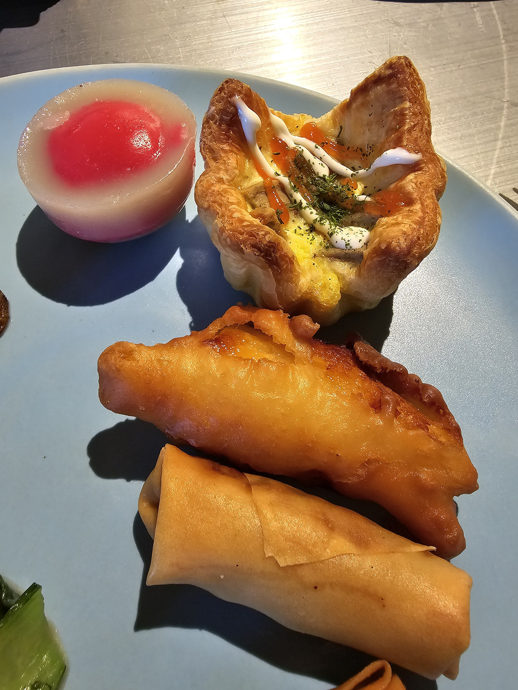 第八天,酒店的自助早餐选择还是比较丰富的,其实要尝遍所有品类,也不太可能在一个早上实现,但是布局有点奇怪,看得出想将相近的品类放在一起,但是又因为各种限制而轻微割裂,就餐面积其实不算小,室内室外都有,还有一个半露天平台可以饱览酒店的花园和泳池景致。但是鲜榨果汁只有西瓜汁和红石榴汁,其他的虽然放冰箱里,但是并不纯正。各种出品的质量都不错,特别是水果。还有炸菠萝蜜,比较特别。职员的态度都很好,笑面相迎之后,都会尽力满足客人的要求。