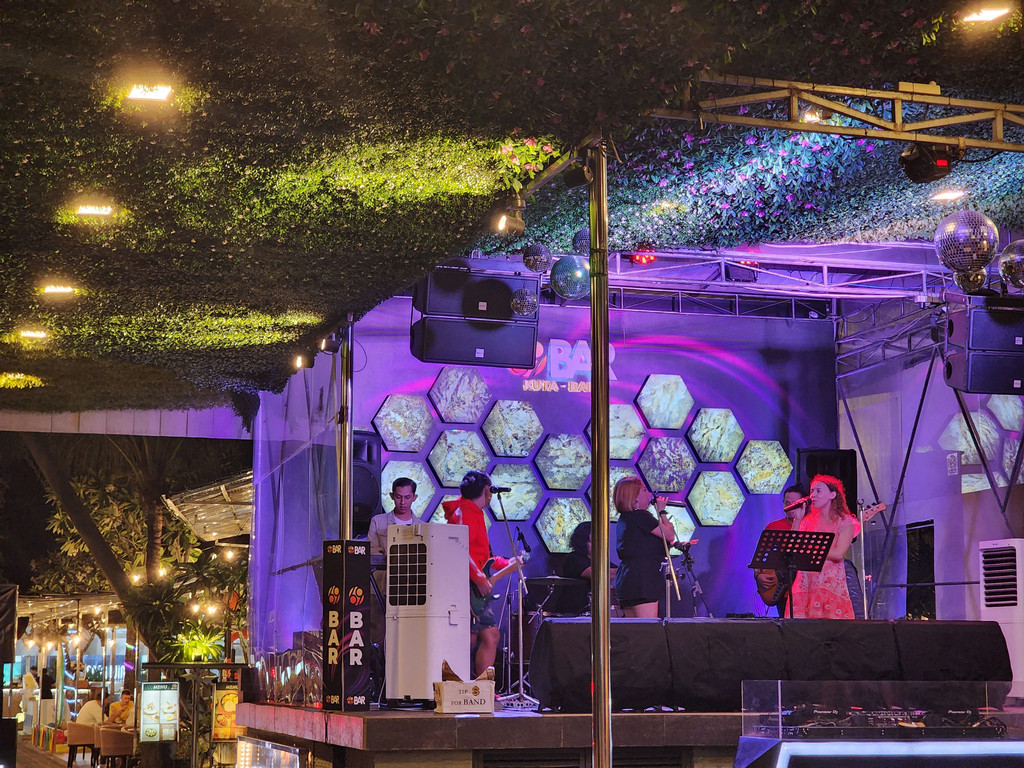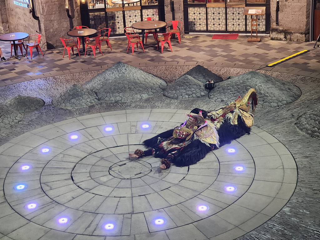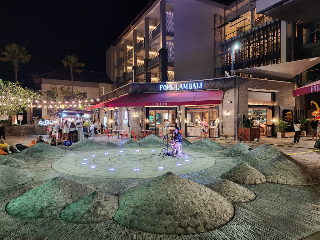 全身按摩的放松之后,我们走到Samasta Lifestyle Village,这是一个露天商业街区,建筑风格明亮而有现代感,错落有致,我们走进来之后觉得很舒适,估计大多数人都会愿意走走看看,虽然是露天街区,傍晚时分并不算太热,里面虽然以餐厅为主,不过还是有一些售卖印度尼西亚特色商品的店铺,装修和摆设都有些特色,一些Cafe小店,也可以闲坐打发时间。晚上七点有巴厘岛舞蹈表演,Barong Dance,据说是展现巴厘岛的神话,Barong是善良精神和守护天使的象征,在正义与邪恶的永恒故事中,Barong如何战胜邪恶的Rangda。舞蹈者会先舞动Barong围绕这个露天商场走一圈,之后在中央的小广场开始舞蹈表演,持续一个小时。八点十五分还有Acoustic Night,有歌手在中央的小广场自弹自唱,暑热散退的晚上,坐在室外,听着现场音乐,喝着咖啡或者鸡尾酒,不失为一件惬意的事。不过整个商业街区店铺还是偏少,很难让其他地方的人专门前来,更多依托周边的酒店和度假村带来的人流。