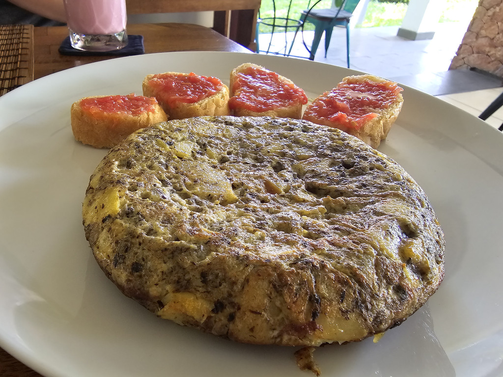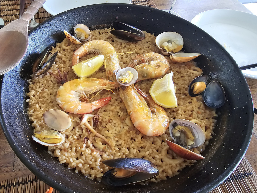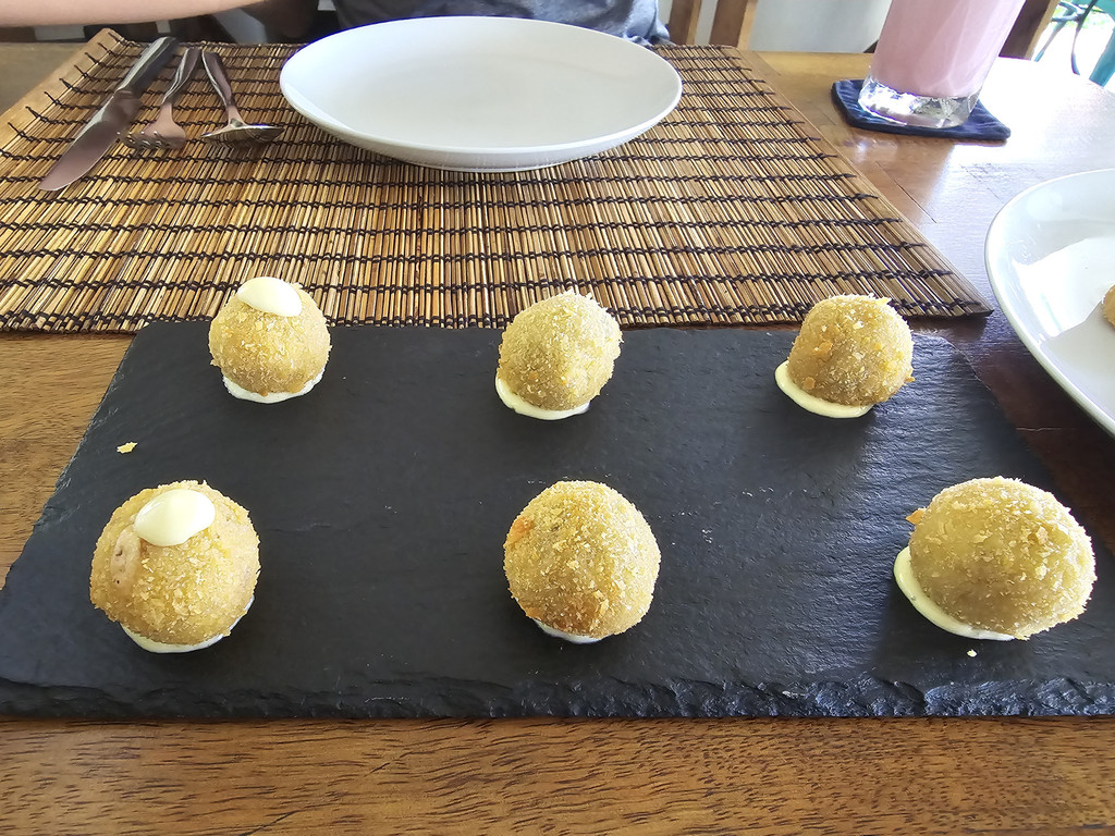 临近中午,我们继续沿着金巴兰沙滩向北走了一段,上午的沙滩明显比之前人更少一些,即便今天是岛上一个宗教节日,有一些本地人会放假休息来到这里休闲。离开沙滩,我们去了另一家金巴兰地区评价比较好的西班牙小食餐厅AKUA de Bilbao,这家的性价比比较高,估计因为室内只有吊扇没有冷气,也是一个提高了。其中性价比的原因。Milkshake不是使用新鲜水果,应该是奶昔粉做的。Bali Colada,是一款Mocktail,粉红色的外表下居然是菠萝和青柠的味道,比较清新。Coconut-Orange,椰子水加柑橘的组合很少见,不过味道还算可以。Tortilla de Patata Trufada,份量不少,小小的土豆块混合成的薯饼,吃起来比较松散,不像看起来的结实,混合香味浓烈的黑松露,正好提升土豆自身不算多的味道,伴碟是脆口的面包涂上了一层鲜西红柿碎做的酱料,清新可口,不过不能和薯饼一起吃,因为黑松露的味道盖过了西红柿的淡淡味道。Las Famouas Croquetas de Akua,我们点了混合的,丸子炸得香脆可口,一口一个,里面的内陷都是软香的,蘑菇的味道太淡,肉馅的味道略咸,蓝芝士的味道是最吸引的。Paella Marinera de Marisco,铁盘呈上的经典西班牙海鲜炒饭,各种材料基本新鲜,饭略略带生,每一粒都是已经吸满了肉汁的味道,所以略咸了,算是中规中矩的。Lomo de Atun Marinado,吞拿鱼外表略微烤煮,撒上了黑白芝麻,不过我们点的熟度过了一点,稍微浪费了鱼肉的鲜美。