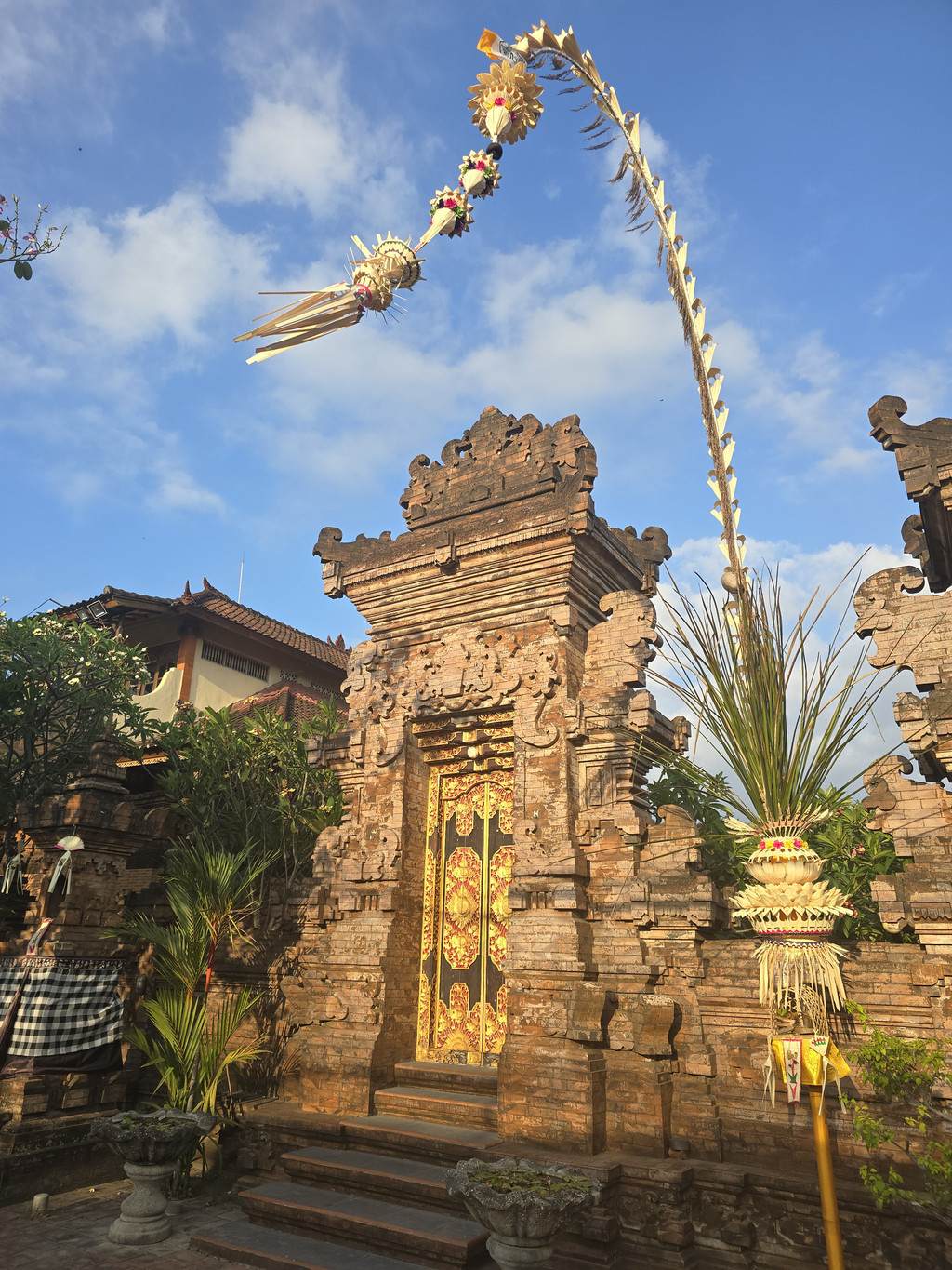 今天是巴厘岛其中一个最重要的宗教节日Galungan,曾经是为了庆祝 dharma 战胜 adharma,现在也是标志着祖先的灵魂访问地球的时间。 我们行走在金巴兰的Jalan Raya Uluwatu,一路上都是相关的装饰和供奉的物品。巴厘岛的道路对行人不太友好,人行道比较窄,不时有不完整的下水道口或者坑坑洼洼的地方,接近占据了整条人行道,车道上摩托很多而且速度不慢,但是道路并不宽,行人走到车道基本就已经妨碍到行车了。但是这已经算是好的,有些路根本没有人行道。