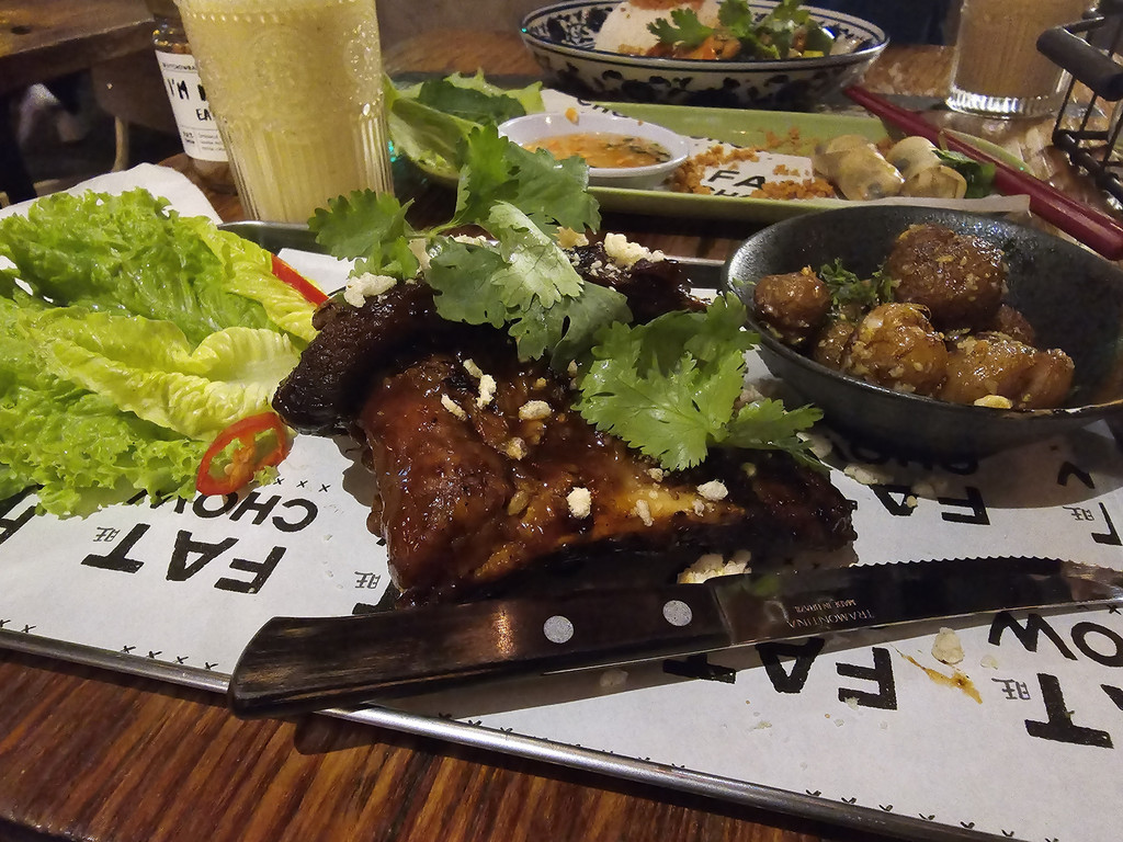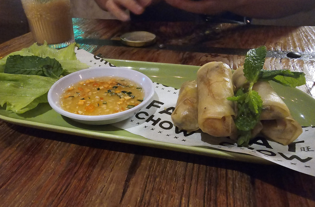 晚餐时间,幸运地在一直有人排队的Fat Chow找到座位,餐厅有点港式茶餐厅的风格,很多香港元素,不过估计真的是用餐客人太多,连饮品都需时很久才能提供。Milkshake,算是真材实料的,但是味道的搭配有点不协调。Smoothie,口感绵滑,味道浓郁,当然也有可能是因为我们等久了,口渴导致的。Chicken Cashew,就是一盘港式茶餐厅的爆炒鸡肉片客饭,但是可能明显感受到爆炒过的锅气,调味上也添加了一点青柠的微微酸味,以显示东南亚菜的特色。Pork Ribs,肉质还是略微过熟了,仅仅保留些许的肉汁,而且这家用的肉排并不是完全平整的,带一点弯骨,估计因此令烤焗的过程过火了,酱汁的甜度比之前吃过的更高,不过作为吃惯了广式叉烧的我们,还是在可以接受的甜度范围内。Fry Spring Rolls,这个点心做得不错,外皮较薄而且略微能看到里面的馅料,但是同样做到外酥内软,不像很多春卷为了外皮酥脆而裹了厚实的外皮。