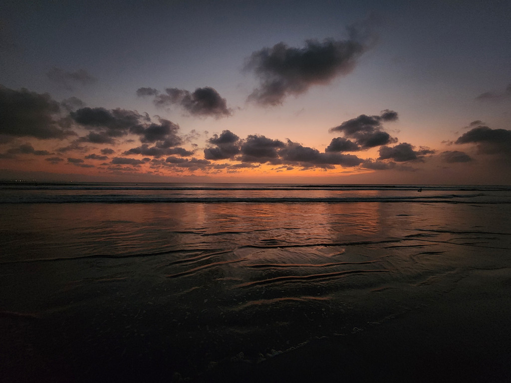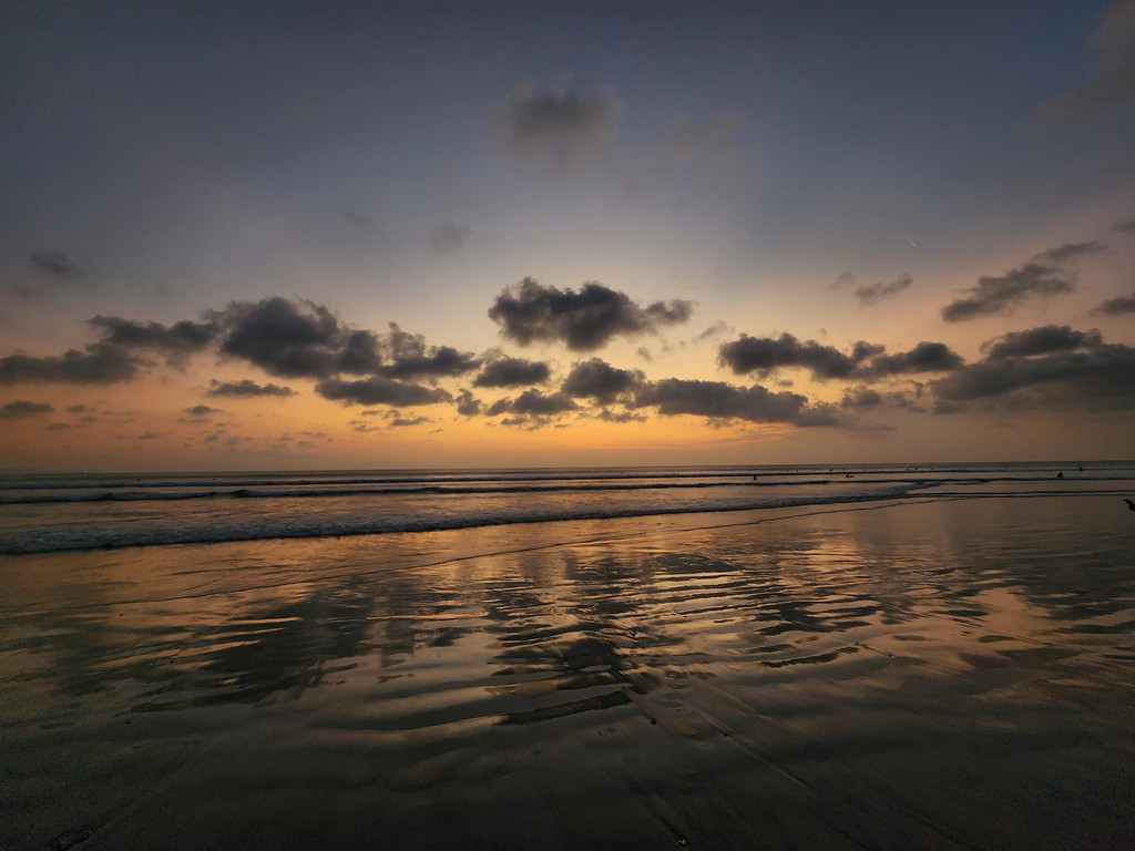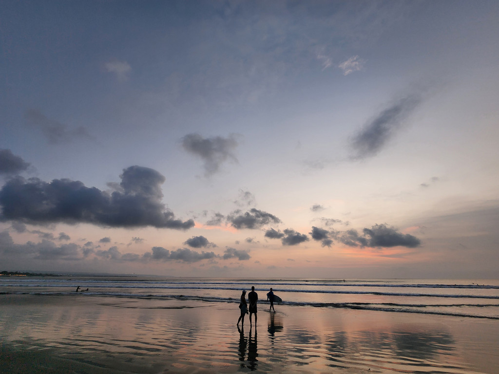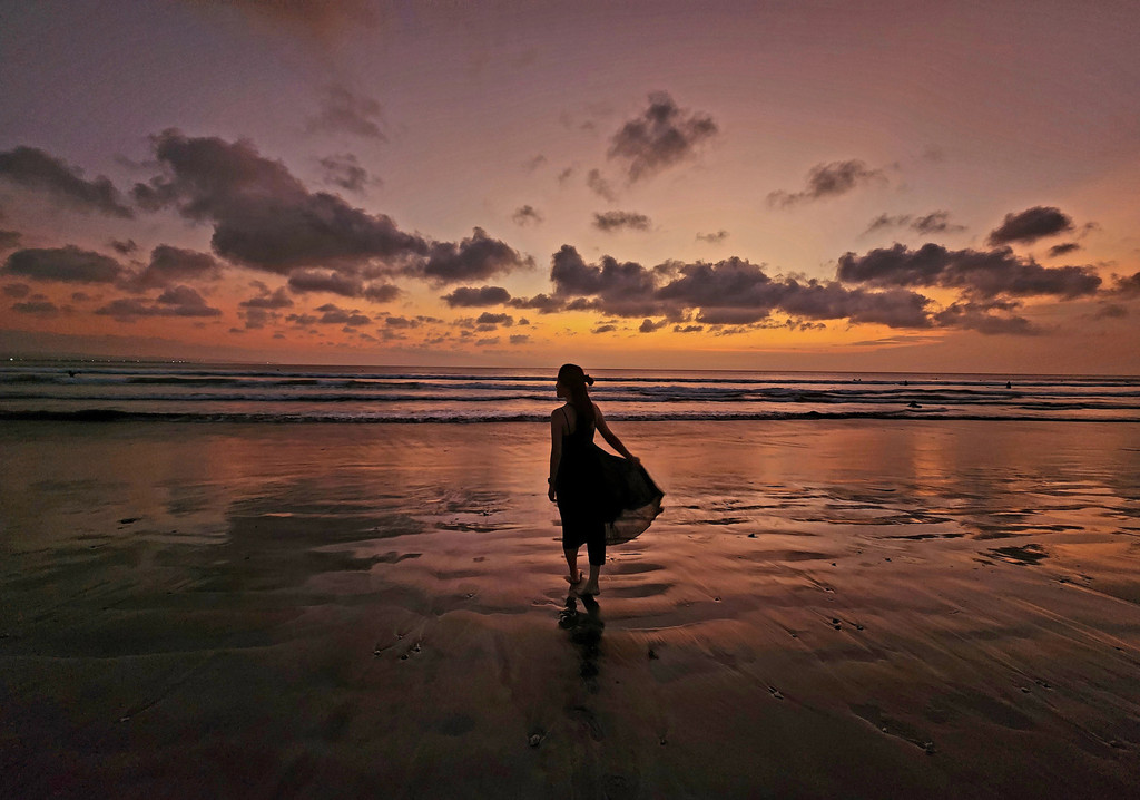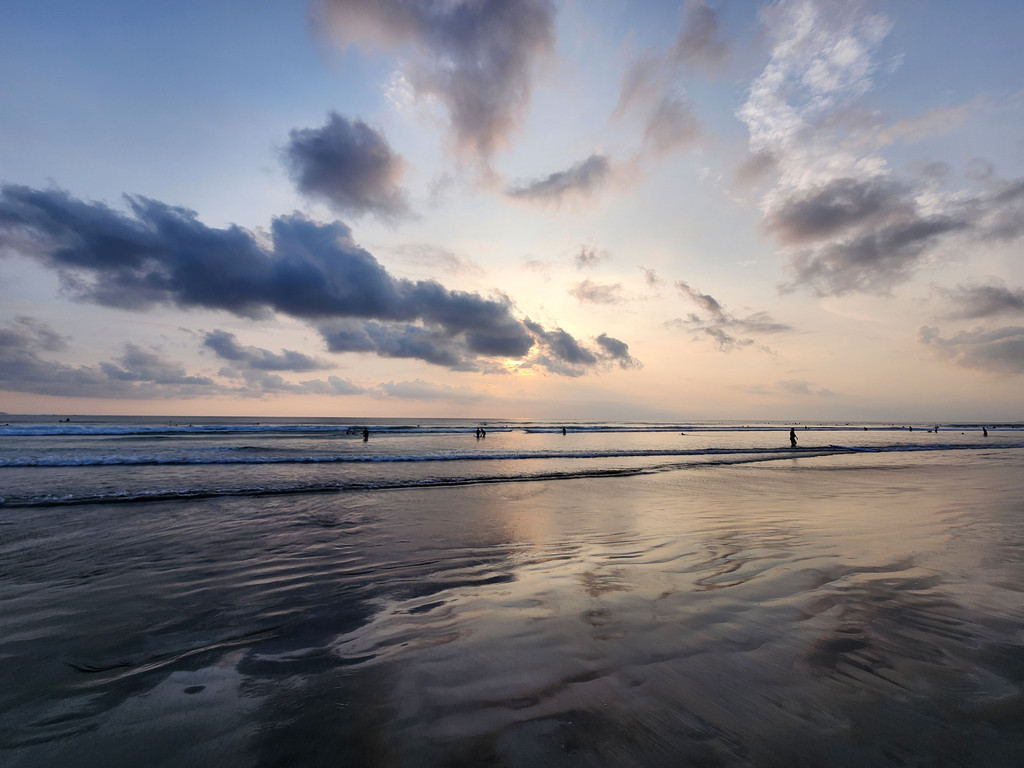 回到库塔沙滩,刚好是日落时分,虽然今天的海天交界的天边依旧有厚重的云层,夕阳沉没于海天之间的景致依旧看不到,但是无碍我们追逐晚霞的心。海水涨退在沙滩上形成的水迹,成了最好的倒影生成器,映照着紫红的天空和人的剪影。
