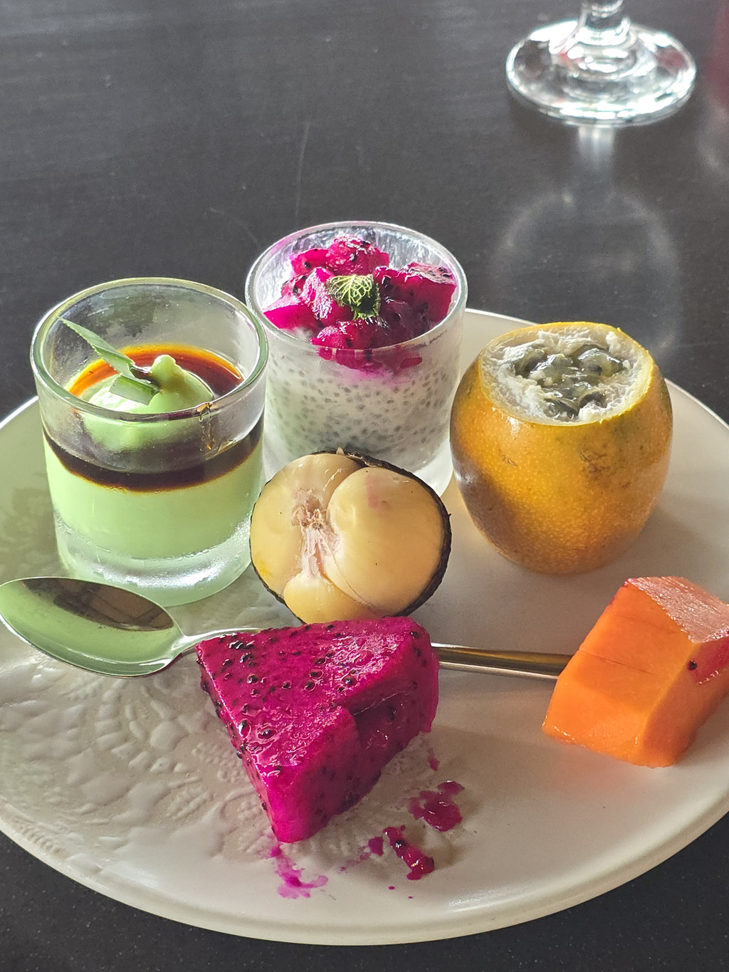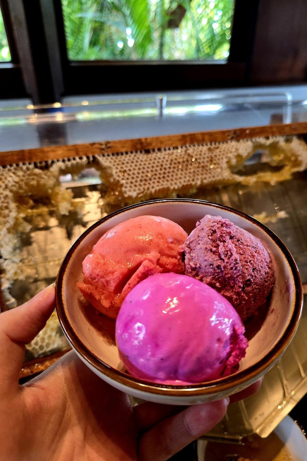 早上的活动之后在Taman Wantilan享用自助早餐,各种冷盘热菜的出品都算中规中矩,并不算是Four Seasons最顶级的水平表现。Eggs Benedict维持很高的水平,主要是中间的水波蛋,那种轻盈荡漾的感觉随着菜品上桌时就能感受到,不过荷兰酱的味道略淡。羊奶芝士,形状看起来像固体,其实口感还是软滑的。但是烧烤和色拉都一般,同样都是偏干,一个缺失汁水,一个丧失水分。惊喜的是种类繁多的鲜榨果汁和甜点水果部分,果汁的浓稠程度恰到好处,特别是木瓜汁和西瓜汁。而八香果的香甜是彻底让我们对这款水果改观的程度,一般吃到的酸涩只是因为时候未到。不过特色水果蛇皮果味道酸苦,这里的西瓜也不行,没有什么味道。自家制的雪糕和雪芭,味道都不错,水果的清新口感得以保持,同时也做到入口即化,沙粒感几乎没有。