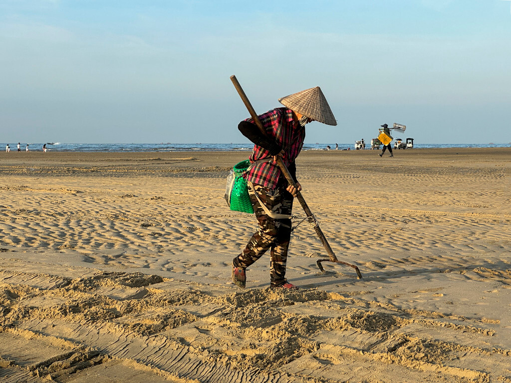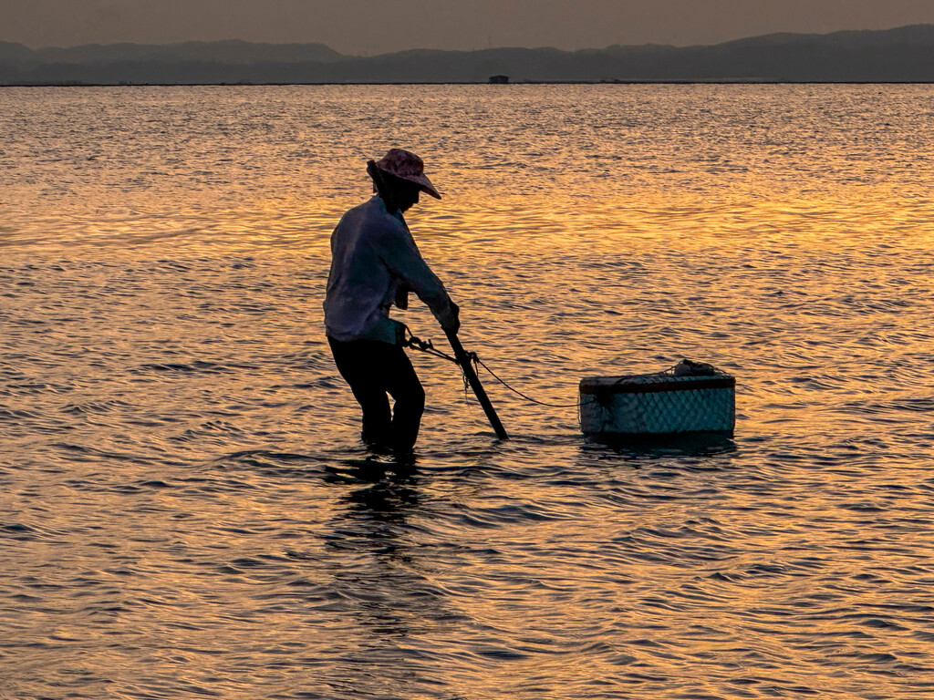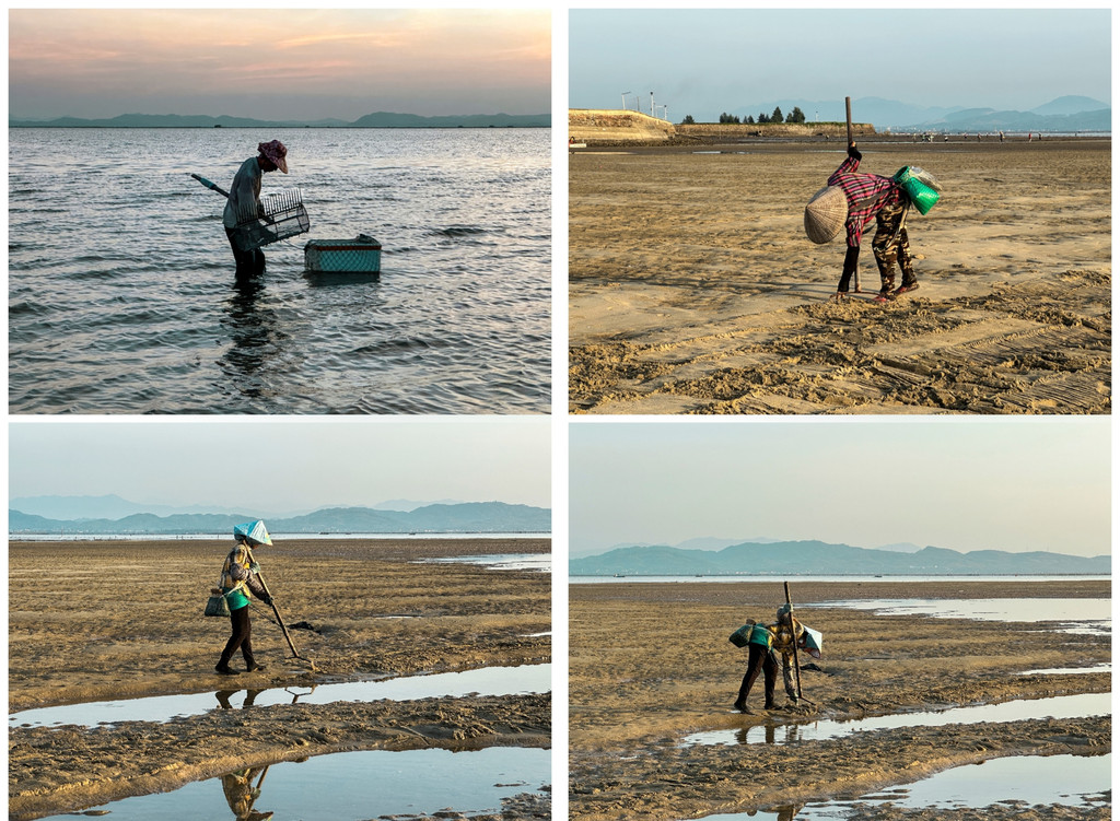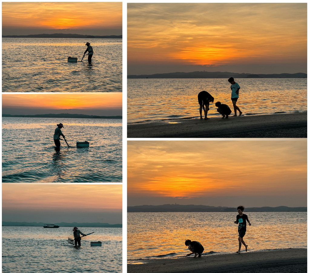 万尾金滩的早晨,海边的渔民在太阳出来之前就开始工作,要赶在海水涨潮前完成一天在海滩捕捞的任务,最晚忙到中午,那个时候海平面升高,没办法下海了,这就是她们的“赶海”。