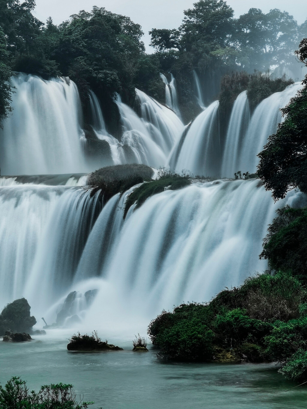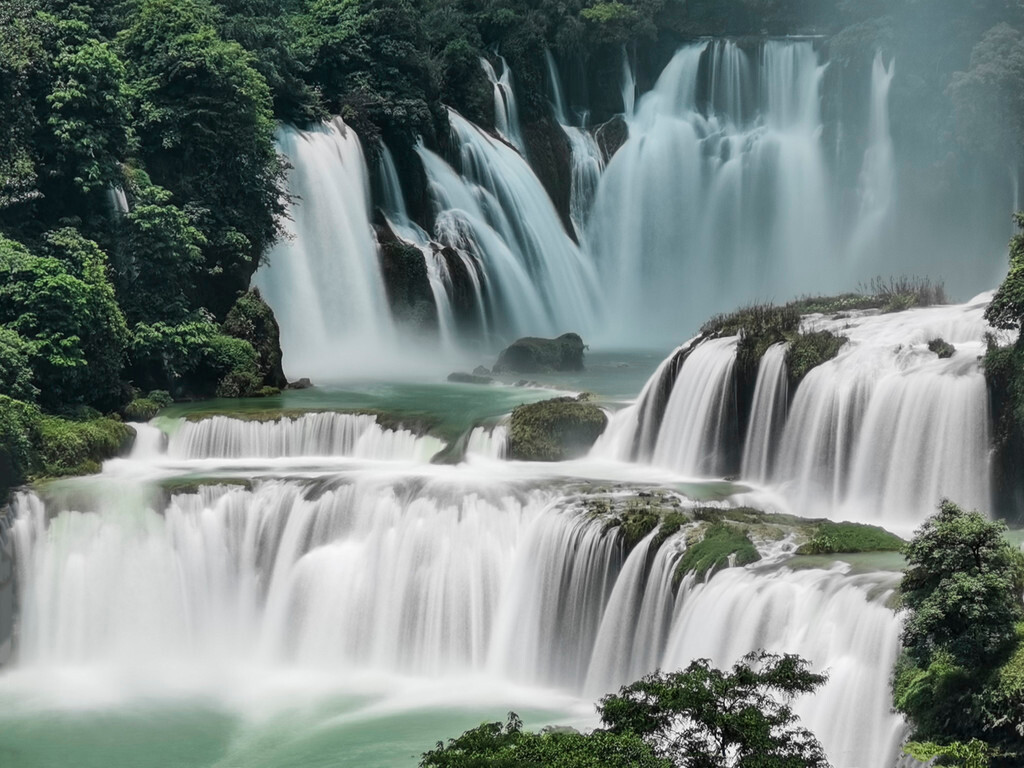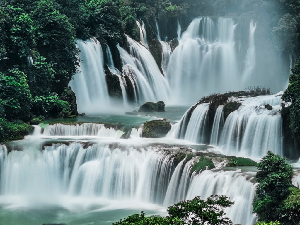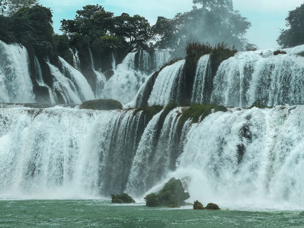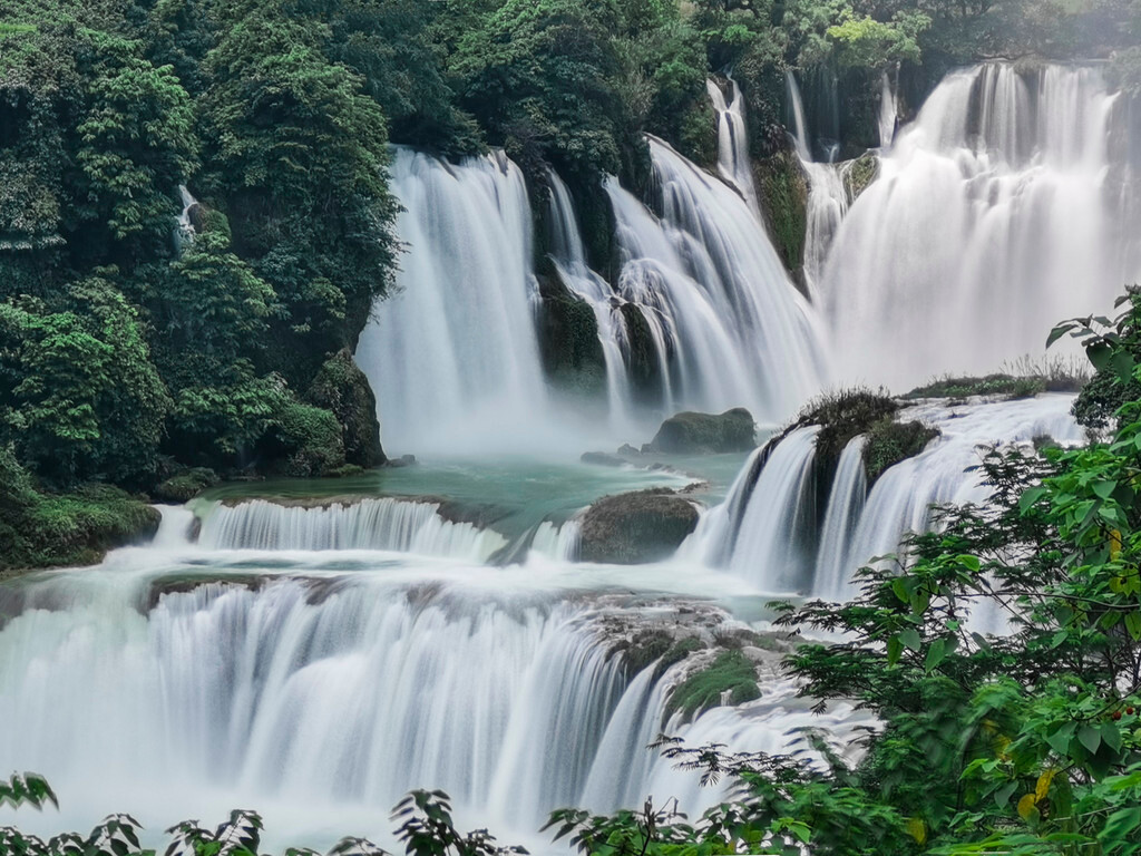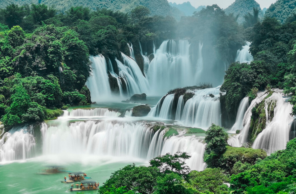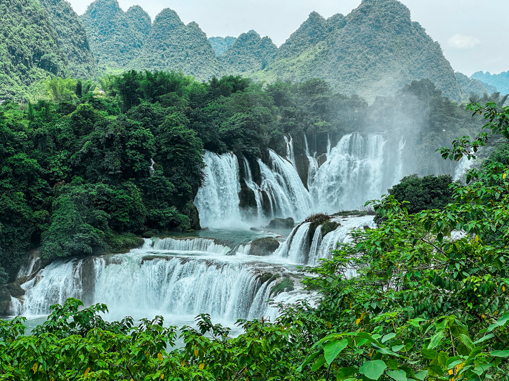 亚洲第一、世界第四大的跨国德天大瀑布三级跌落,与越南的板约瀑布一大一小连为一体,挂在青翠的山崖间,就像一对亲密的姐妹紧密无间。
