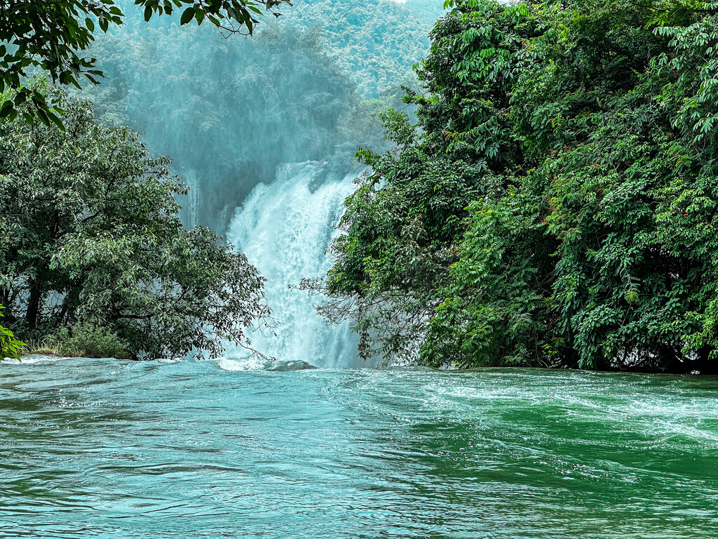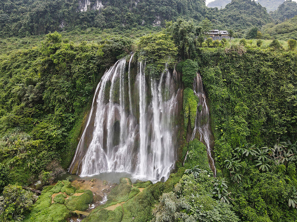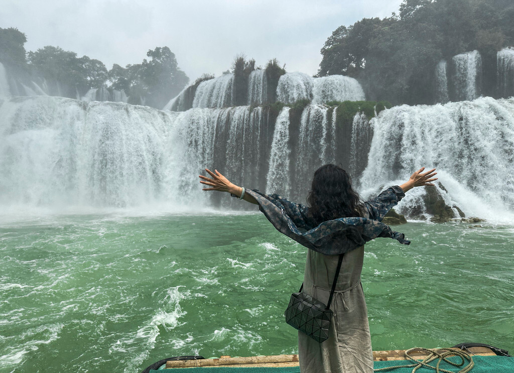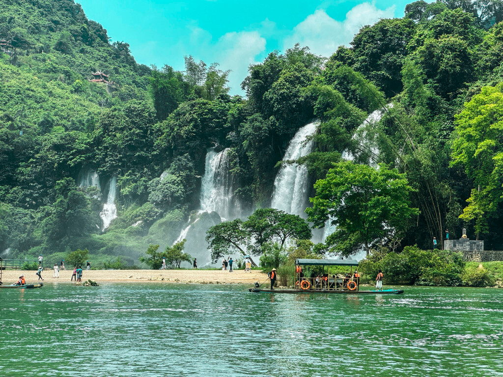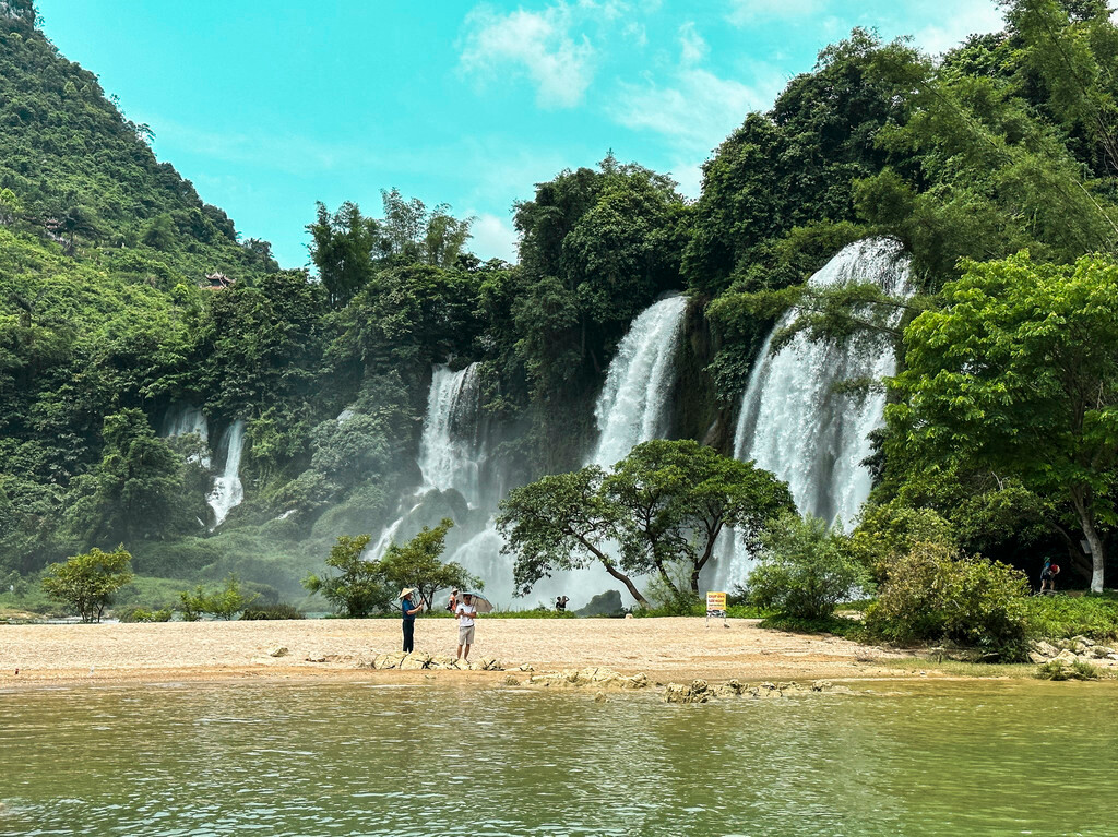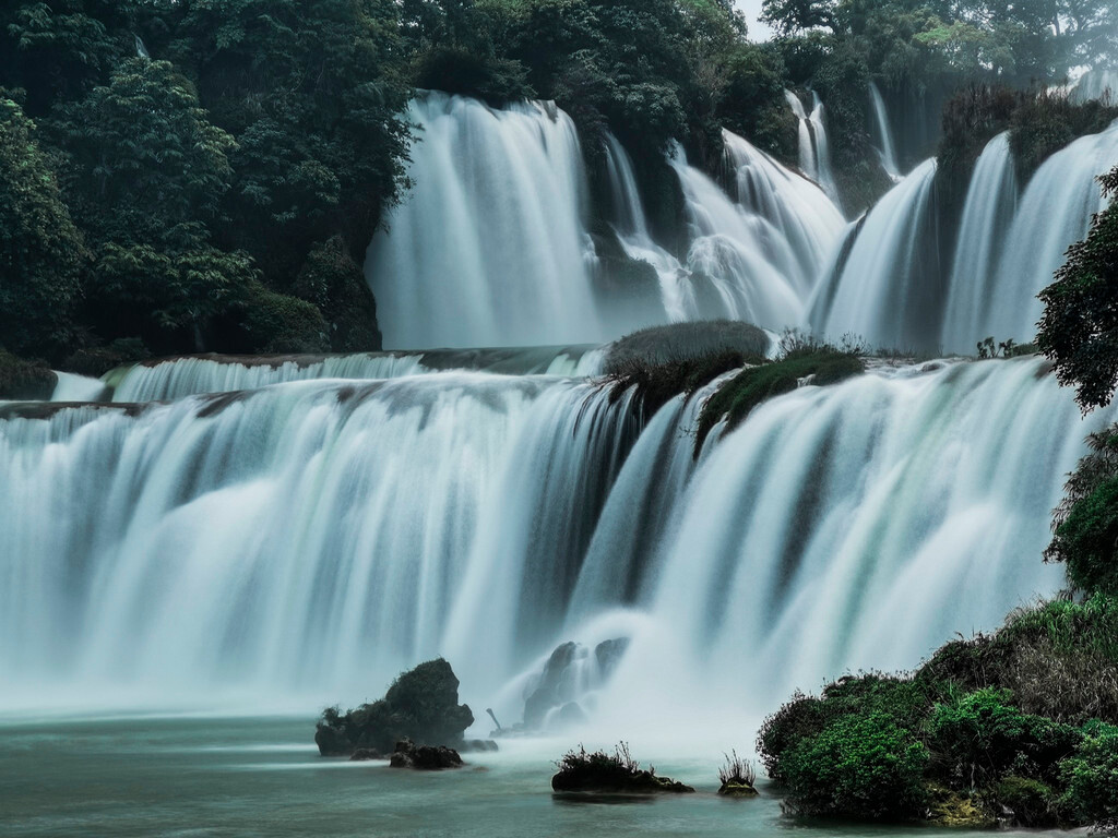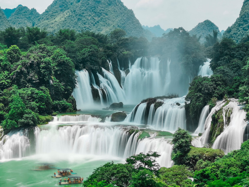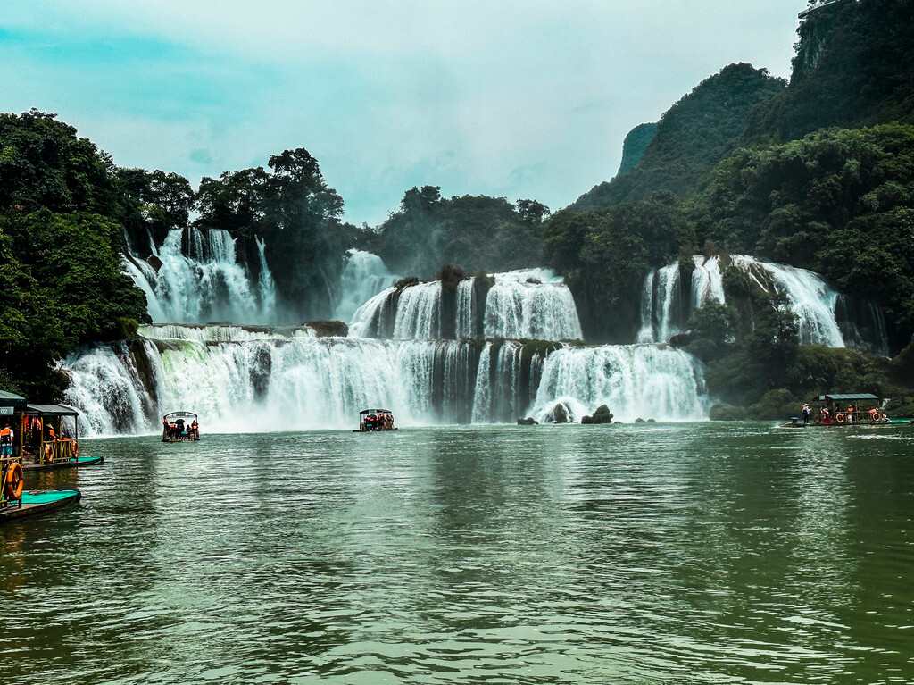 亚洲第一、世界第四大的跨国德天大瀑布三级跌落,与越南的板约瀑布一大一小连为一体,挂在青翠的山崖间,就像一对亲密的姐妹紧密无间。