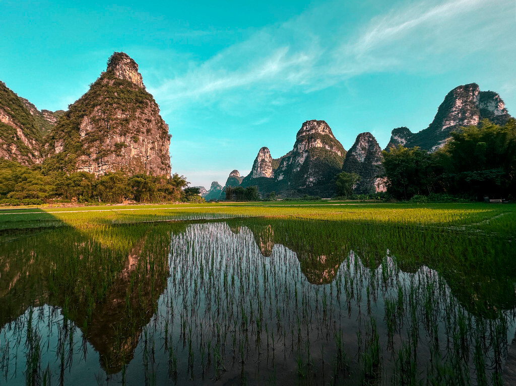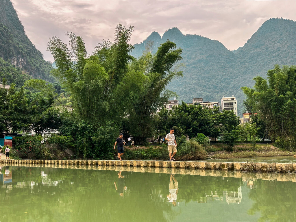 靠近边境的明仕田园,美丽的山峰,明镜似的小河,划入天际的扁舟,满洒的翠竹,绿油油的稻田,乡土风味十足的水车、水渠与独木桥,极富南国田园气息。