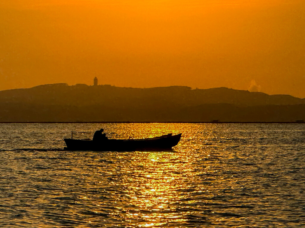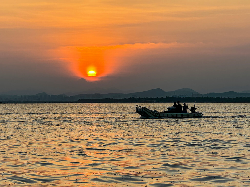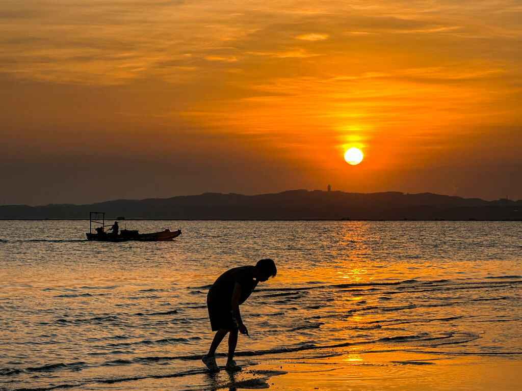傍晚,柔和夕阳洒向万尾金滩细腻的沙滩,捕鱼归来的渔船在这里搁浅,渔民脸上饱含收获的喜悦,满目的金灿灿冲击着日落惊艳的视觉。
