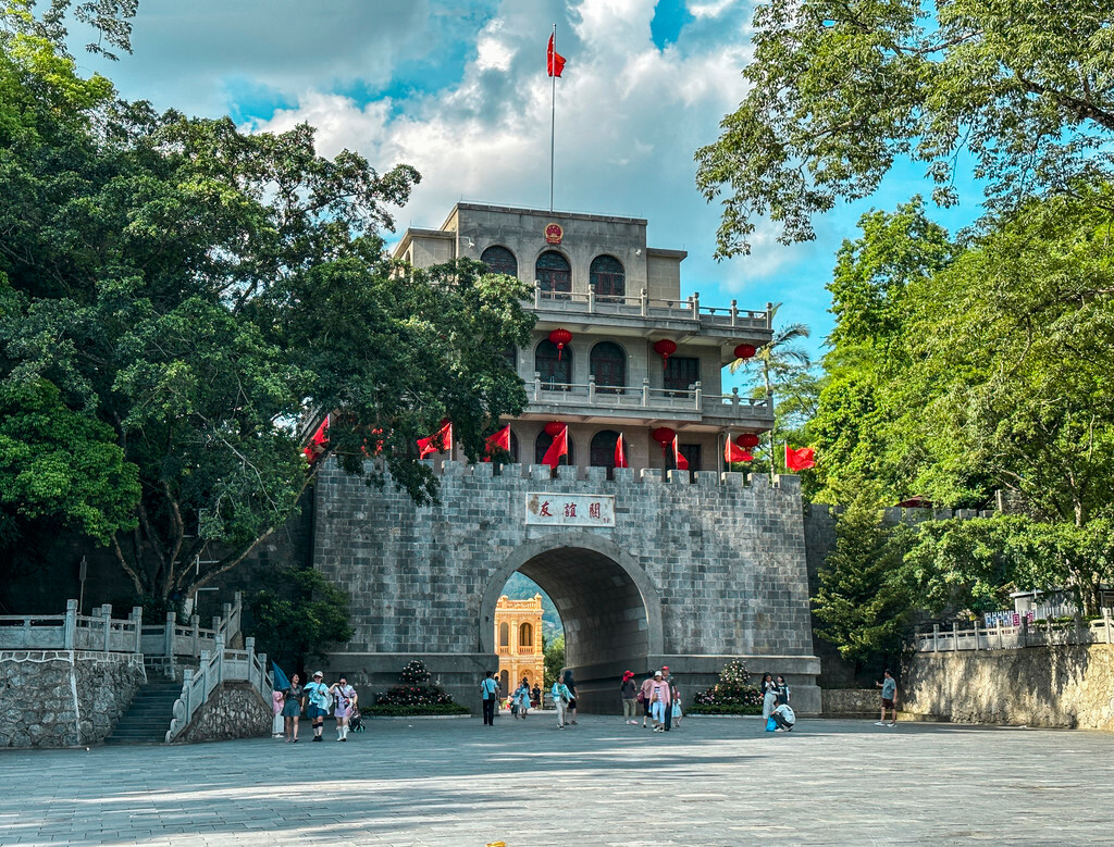 史上发生过闻名中外的“镇南关大捷”和孙中山先生领导的“镇南关起义”的友谊关关楼雄伟伫立。圆拱顶的中央城门,汉白玉雕刻镶嵌的陈毅元帅手笔“友谊关”匾额,厚实的底层城墙,两侧高耸峭拔的山麓,险峻地势居高临下,展现出九大名关、南疆重要边防军事要塞与战略要地的雄姿。
