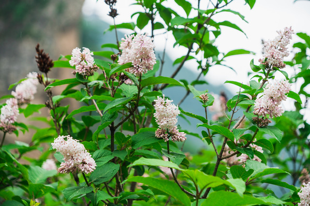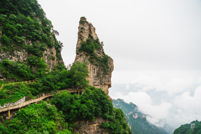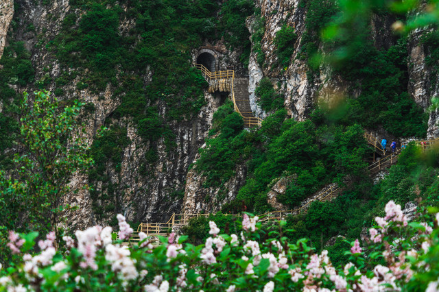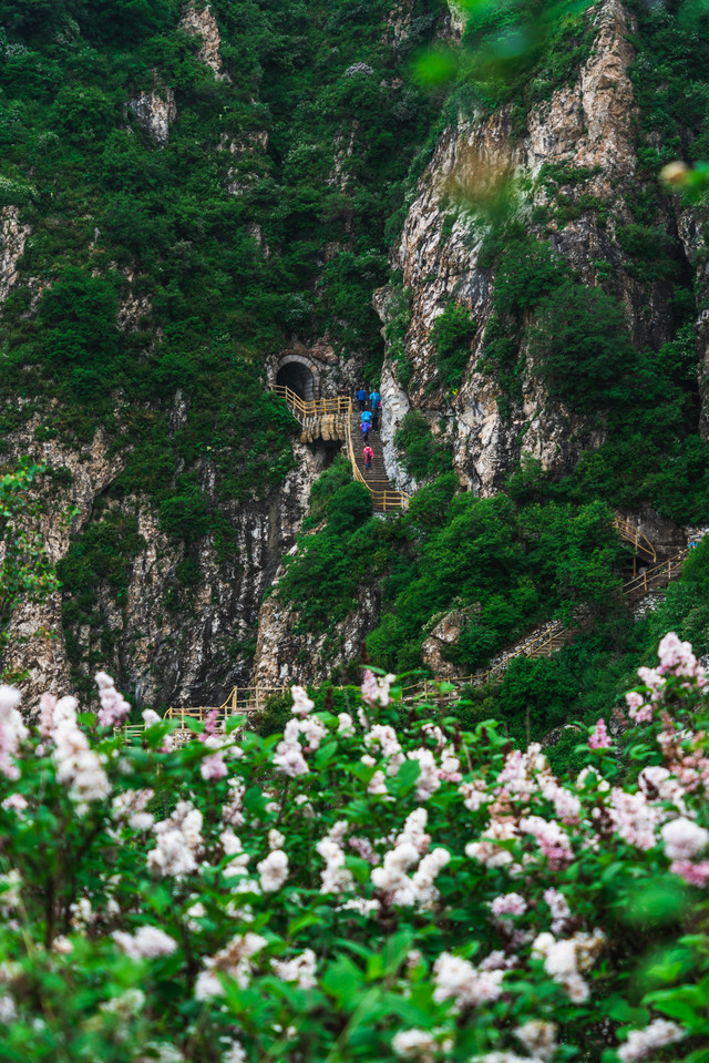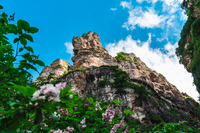 在蒙蒙细雨中,我们沿着崖壁栈道一路前行,开满山岗的丁香花随风摇曳,清风徐来,也带来了花的香。在白石山看的就是大理岩峰林地貌,古老的地质时代,太行山脉与燕山山脉交错的地方,两条古老的山脉角力,形成了白石山山峰密集如林、通天拔地、层层叠叠的四奇景象:峰多、壁峭、形异而势险。