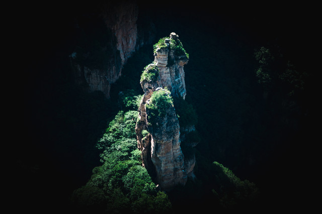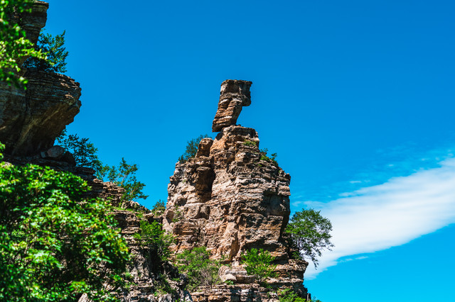 名为海豚出水的孤峰在雨后观看最为形象,当山谷出现云海时,孤立的山峰十分像刚跃出水面的海豚,据地质考证,整个孤峰由15亿年前的巨角砾岩组成。