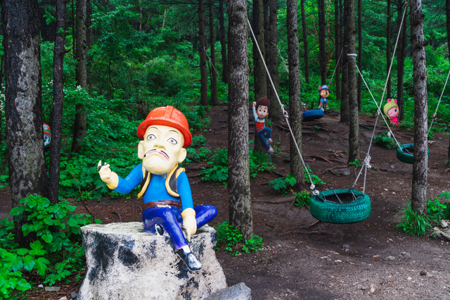 由祥云门到电瓶车乘坐点会经过一大片松林,雨后的松林,那绿色翠得喜人,草叶上有雨珠悄然滑落。树林间还藏着光头强等卡通形象,天气晴好时,这里也是小朋友的乐园,可以在这里荡秋千,捉迷藏。