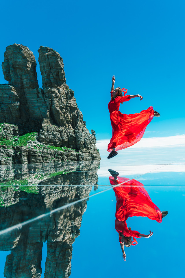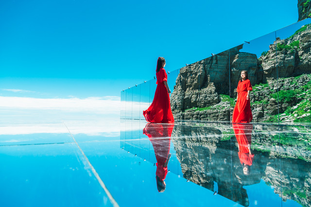 天空之镜是白石山的新晋网红打卡点,不用远行就能打卡的绝世美景。天空之镜也是天空之境,位于景区海拔1900米游线双雄石景点处,天空之镜占满了双雄石小吃城的屋顶,由独特工艺定制的钢化玻璃镜面平铺而成,占地面积约400平方米。