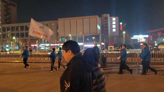 回酒店后休息了一会,我们去保定火车站前的广场遛弯,遇到了一队健步走的队伍,领队高举旗帜,队员穿着统一的服装,还有个队员背着音箱,队员伴着嘹亮的乐曲,情绪饱满,是广场前一道亮丽的风景线。我老公还跟着走了有半个小时。