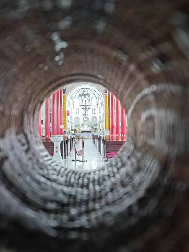 我们上午去时教堂内部还没有开放,就从大门上的锁洞处拍了张照片,见下图。下午我们参观完古莲花池后又去天主教堂看了看,这时开放了,就进去看了看。