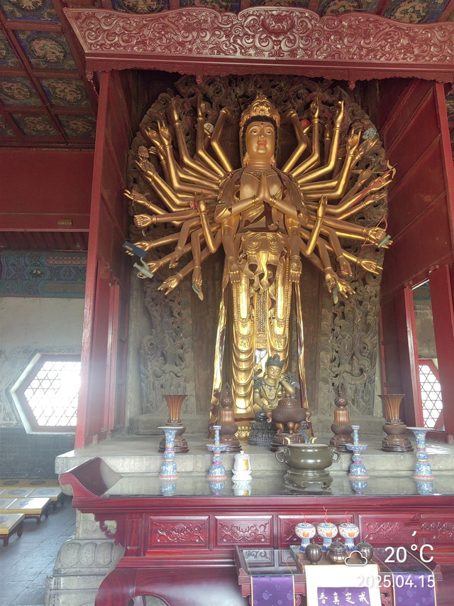 大慈阁通高31米,阁前是22级台阶,移目阁内,观音菩萨矗立于莲瓣须弥座上,神态安然。观音像为木雕,高5.5米,42支手臂持各种法器。阁内两侧有壁画十八罗汉及经变故事,为清末作品,尚清晰可见,神态各异,是阁内艺术珍品。二、三层皆面阔三间,进深一大间,阁内藻井、檩枋均绘旋子彩绘,四周作围廊,依栏鸟瞰,市井民宅历历在目。但游客不能上去。
