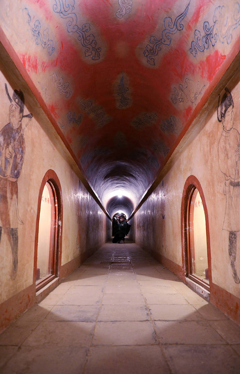 她的墓室地宫与秦王地宫略同,但墓室庭院前那座高8米、宽4米,用青砖仿木建造的地下飞檐古建端楼,却保存完整,完美的承载了唐末五代工匠艺人精妙绝伦的建筑艺术,气势恢宏古建艺术,为全国唯一,世界罕有。