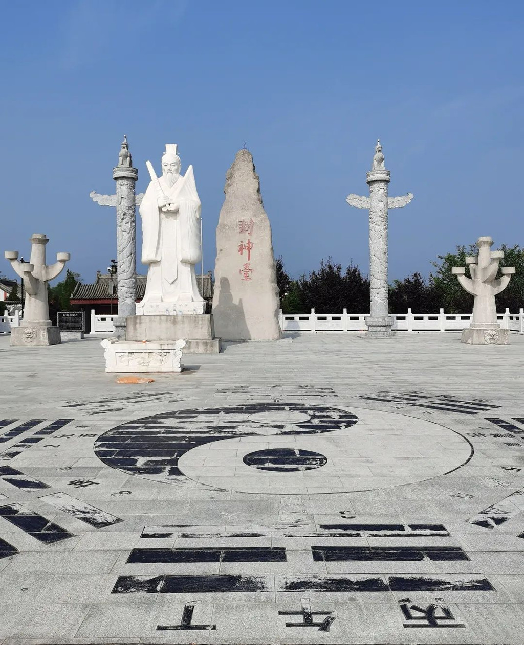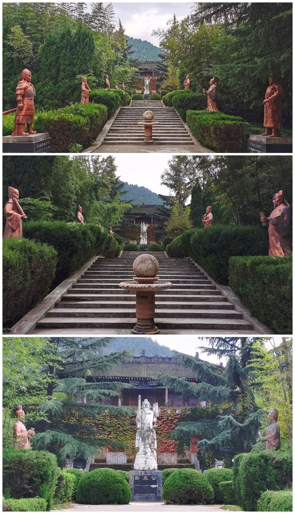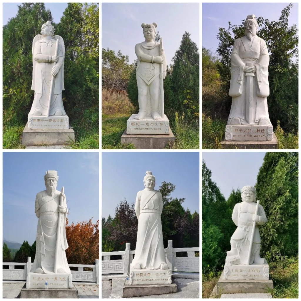 (入口石道两侧列有古代贤臣良将雕塑,尽头中央是姜太公)