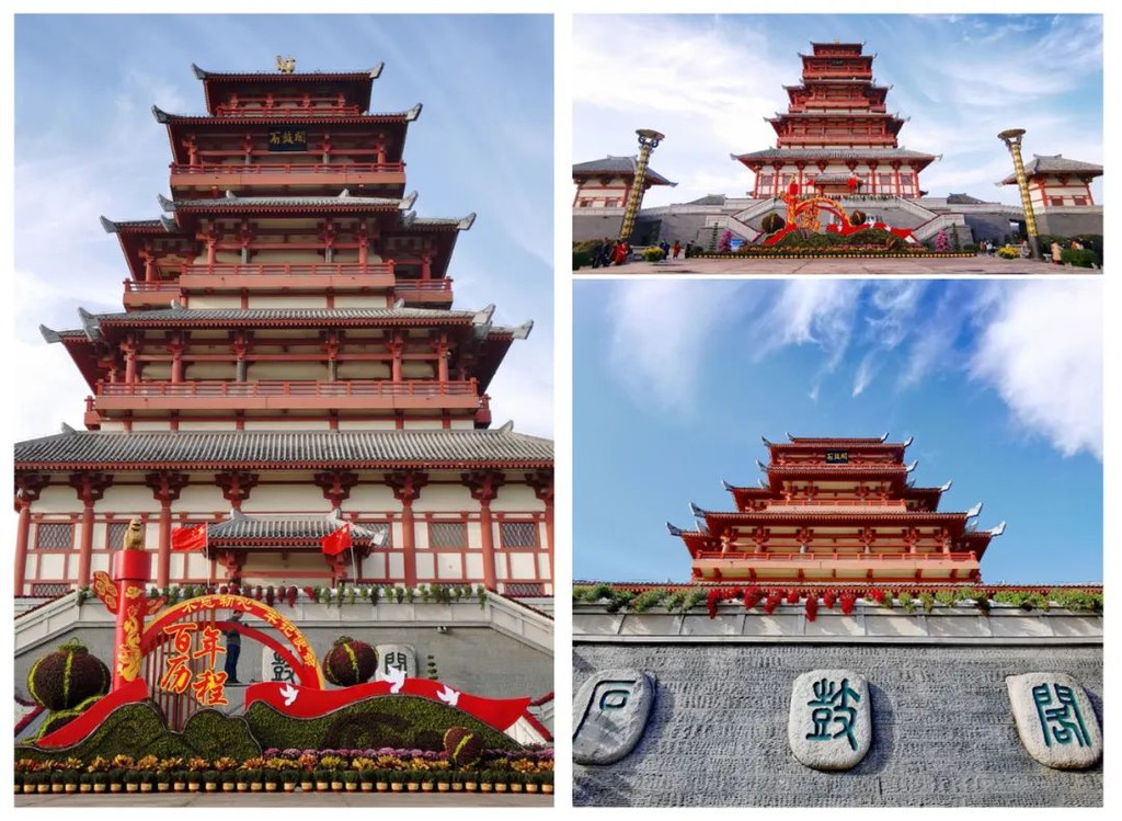 博物馆西侧是石鼓山标志性建筑——石鼓阁,阁高56.9米,仿秦汉建筑风格,采用外五内九的层级设置,气势雄伟,堪称西北第一阁。
