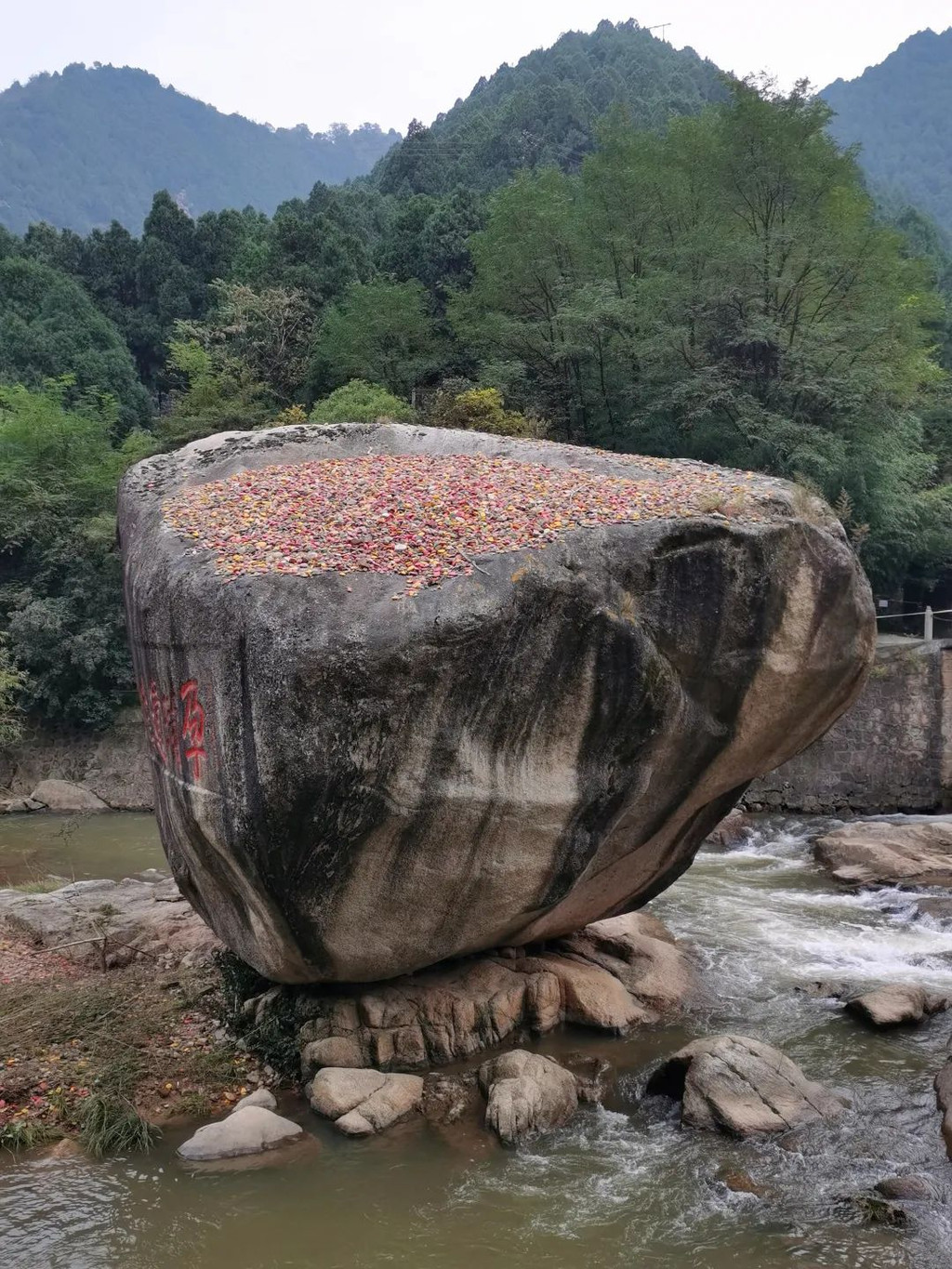 下图为“钓璜灵矶,又称“璜石”,俗称“丢石”,为宝鸡外八景之一,上巨下锐,似倒锥状屹立在溪水之中,貌若泰斗,雄宏壮观。