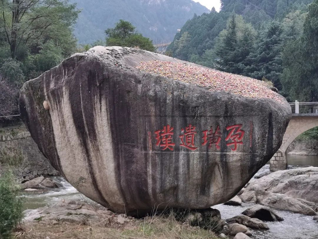 相传当年姜子牙在此垂钓时从鱼肚中剖出一粒小石子,随手扔到河中,没想到小石子见风就长,眨眼功夫长成现在这个样子。石上有四个苍劲大字——孕璜遗璞,寓意磻溪河畔孕育了一代贤臣姜子牙。当地人相信丢石子于其上可实现心中梦想,丢石上可见不少彩色小石头,都是一粒粒过路人的愿望。