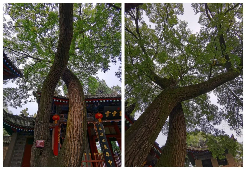 下图为庙中奇槐,三支分叉合为一体,自然天成,喻意天下大势合久必分,分久必合,又象征刘关张桃园三结义,形状奇特,世所罕见。