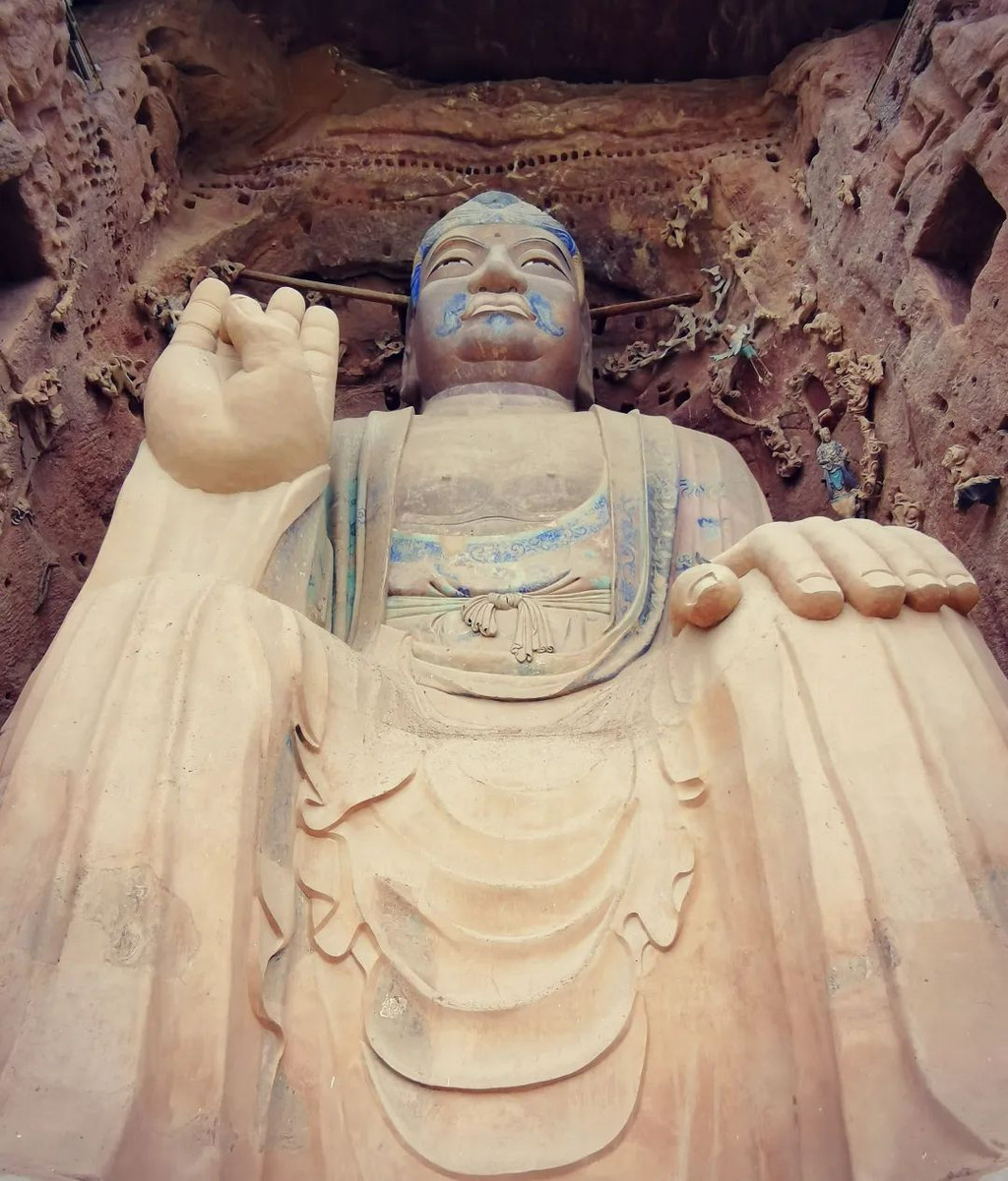 下图为大像山上的大佛殿,位于山上200米的崖窟内,窟高34米,宽14米,深4.5米。窟内有依山开凿的石台泥塑唐代大佛一尊,佛高23.3米,肩宽9.5米。大佛躯体宏厚高大,发型为水波纹肉髻,面相庄严,静穆慈祥,左手平放膝上,右手施吉祥印。该佛是渭河流域唯一一尊唐代大佛,也是全国同类大佛中相对地面最高的一尊。