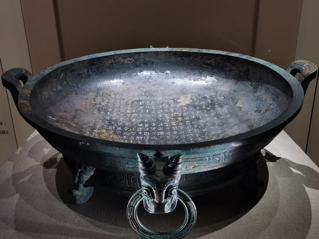下图为西周的逨盘。盘为盛水器,常与盉搭配使用。逨盘內铸铭文372字,记载了单氏家族八代人辅佐西周十二位王征战、理政、管治林泽的历史,对西周王室变迁及年代世系有着明确的记载,可印证史书的记述。
