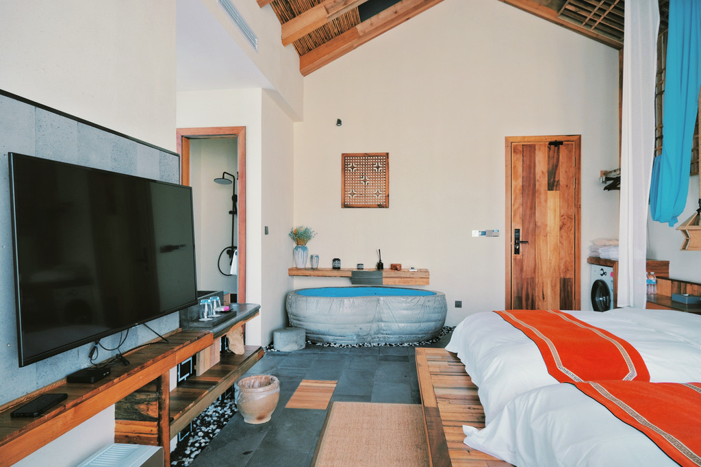 有两间卧室,适合一家三口过来度假,让孩子体验茶文化。